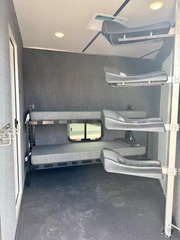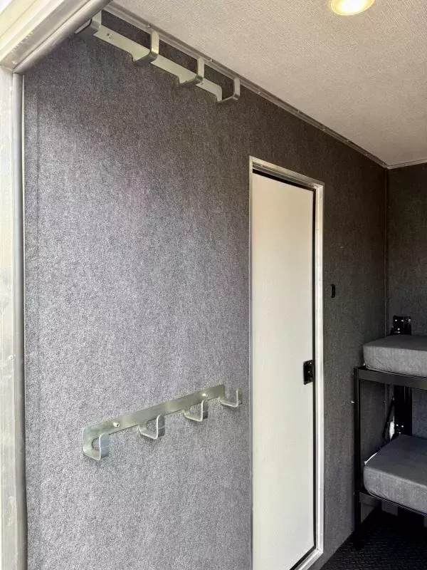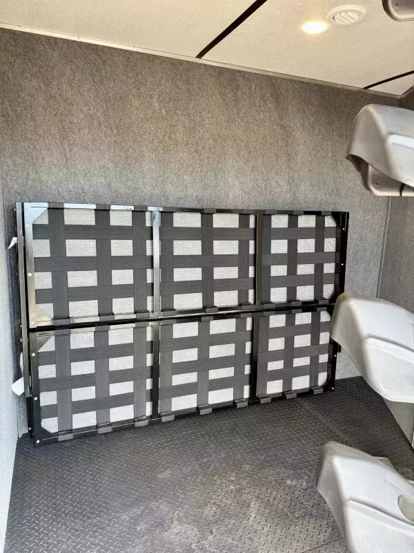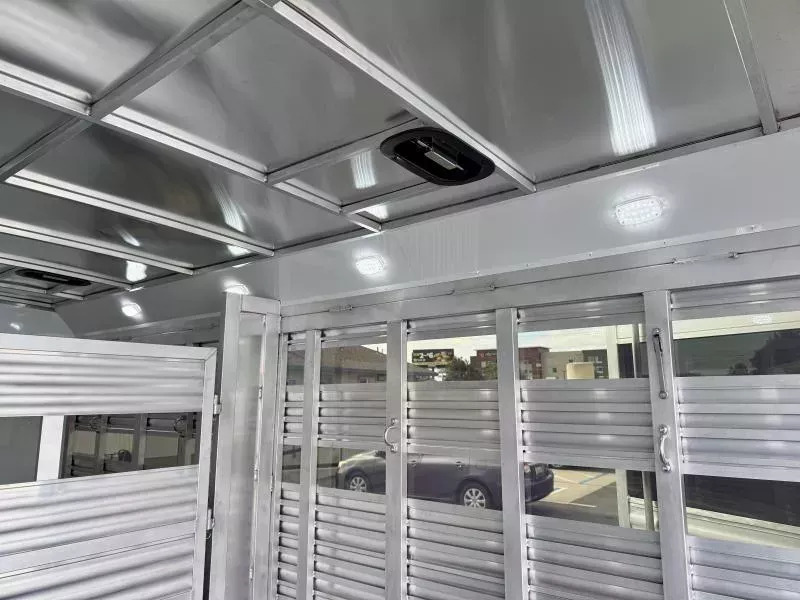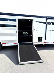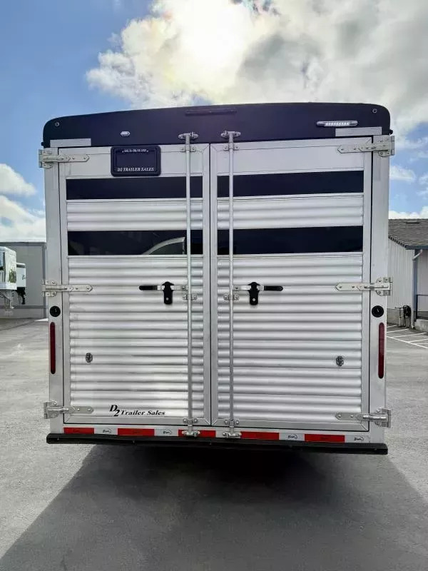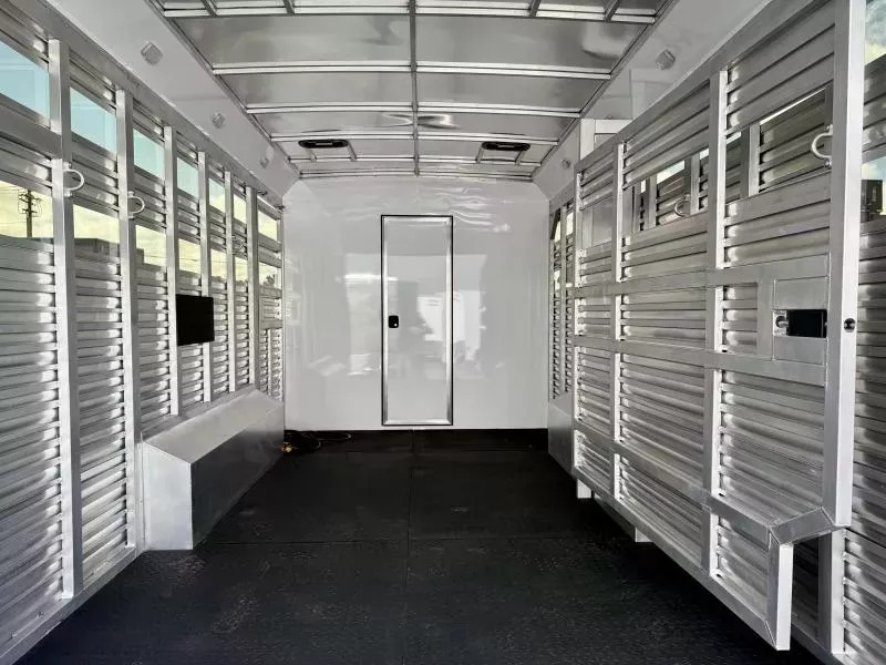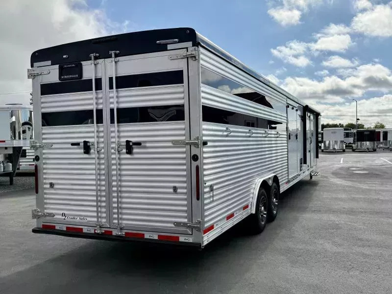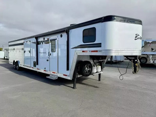 2026 Bison Trail Hand 9’ Living Quarters with Midtack / Bunkbeds, Stock Trailer. * 8’ Wide, 7’6” Tall * Aluminum Frame / Aluminum Exterior * 8,000# Axles with 4 Wheel Electric Brakes * 17.5” J-Rated Radial Tires * Aluminum Wheels * LED Exterior Lights * Power Awning with LED Light Strip * Dual Leg Hydraulic Jacks * Dual Propane Tanks * Dual RV Batteries * White Aluminum Smooth Skin * LED Load Light * Graphics * Exterior BBQ Quick Disconnect * Interior features: * Rustic Interior * Camper Door with Screen Door * Great Steps into GN Bunk * LED Reading Lights * TV/ Radio Antenna * Stereo with Interior and Exterior Speakers * 32” LCD TV on Locking Swing Arm * Jackknife Sofa with Drawers Below * Overhead Cabinets * Wrapped Counter Tops * 3 cu ft Refridgerator * 18,000 BTU Furnace * 15K BTU Ducted A/C * Recessed Cooktop * Microwave * Stainless Steel Kitchen Sink * Sliding Pocket Door into Bathroom * 6 Gallon Gas Water Heater * Radius Shower * Porcelain Toilet * Walk Thru Door into Mid Tack * Mid Tack Room Features: * Side Loading Ramp * Fold Up Bunk Beds * Sliding Window at Bottom Bunk * 4 Tier Removable Saddle Rack * Halter Hooks * Carpeted Walls and RV Paneled Ceiling * Roof Vent * Rubber Floor Mats * LED Lighting 15’ Stock Area: * Side Access Door * Pop Up Roof Vents * Center Gate * Rubber Floor Mats * Removable Plexiglass Inserts * Inside and Outside Tie Rings * Double Rear Stock Doors * Rubber Bumper Call D2 Trailer Sales 209-745-5480 or for more info www.d2trailersales.com