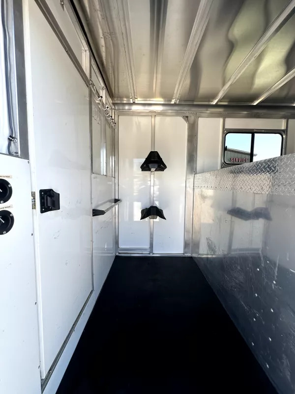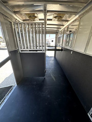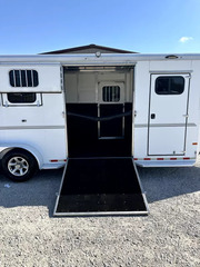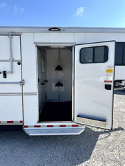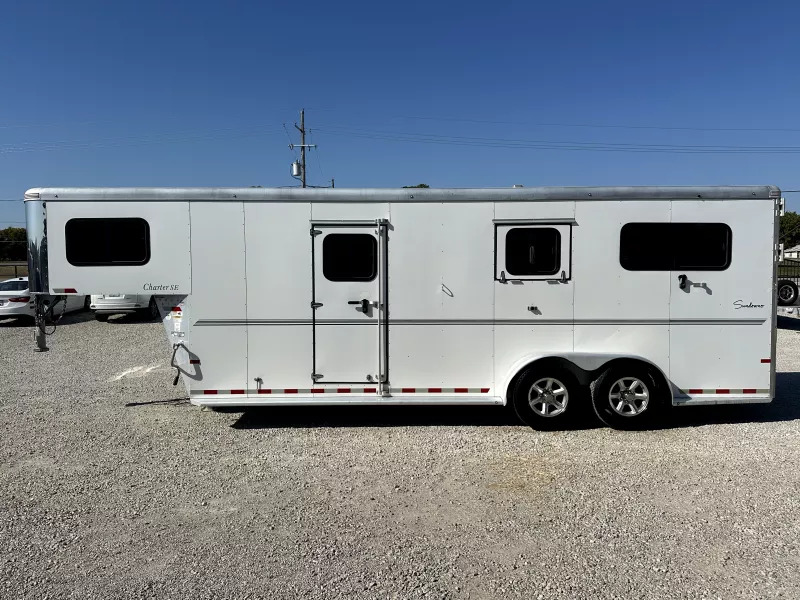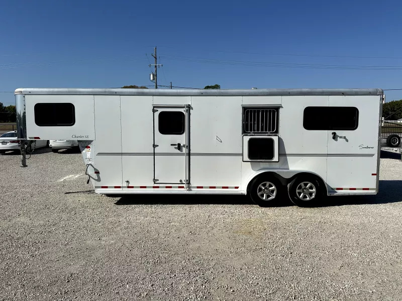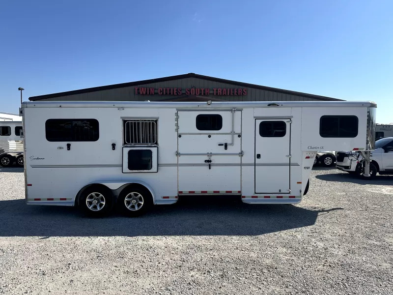 2018 Sundowner 2+1 Charter SE Gooseneck 22’L x 7’6”T Horse Area - rubber mats, kick pads, padded removeable air flo divider, 2 padded chains in +1 area, 2 fans in +1 area, padded chest and butt bars, two removeable swing out partitions, 2 drop down windows w/ drop down face guards, interior LED lights, 2 pop up roof vents, escape door, interior tie rings, side load ramp, rear load ramp. Dressing Room - Brush box, LED porch light, rubber mats, blanket bar, 2 tier saddle rack, 6 adjustable bridle hooks, carpet nose, 1 interior LED light. Other Features - 3 exterior tie rings, 2 rear LED load lights, 1 LED side load light, aluminum running boards, LED clearance lights, spare tire w/ matching wheel, center leg landing gear jack, stainless nose. Professionally serviced on 10-25-25 and included the bearings, brakes and lights. Financing available with rates as low as 6.49% WAC - Nationwide delivery also available Call our sales department at 940-365-9919 After hours calls/texts 612-381-6782