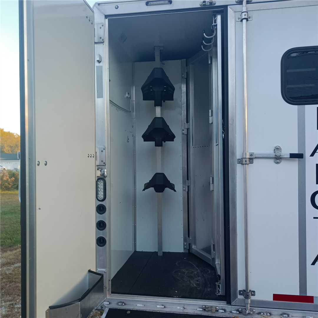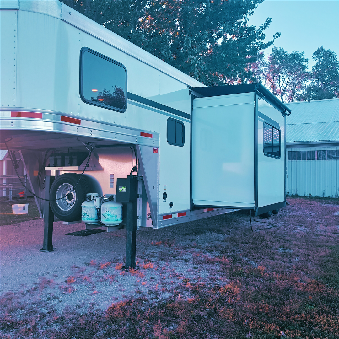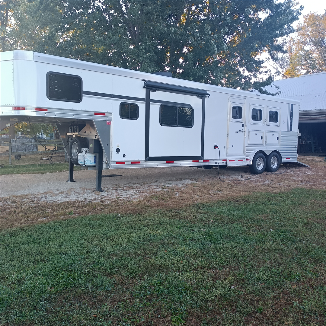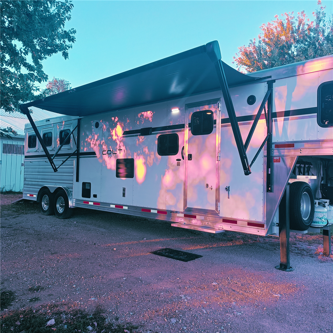 Lakota Colt 3 slant horse full living quarters 5th wheel hitch. Hydraulic electric jack with all the bells and whistles! Big ramp. Like Brand new! Excellent condition! Sleeps 6. Slide out, pull out couch and full bed. Shower/toilet . Lots of space for storage inside and out. Length 38 feet. CD player, good size refrigerator, stove, sink and electric awning. It is in covered storage. Call 815 566 5686. Price $72,000