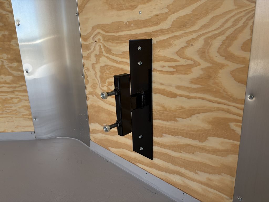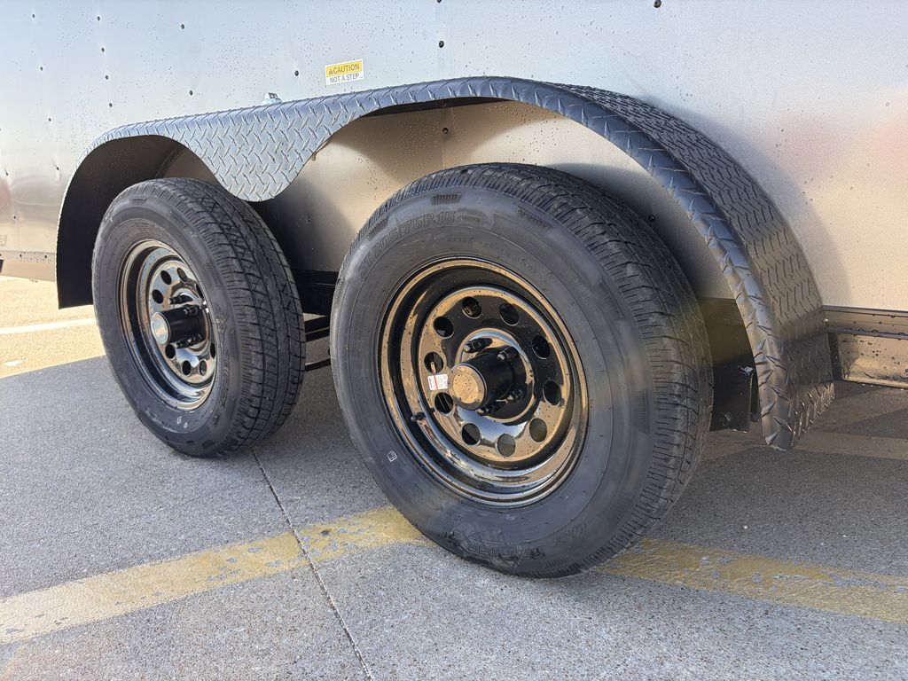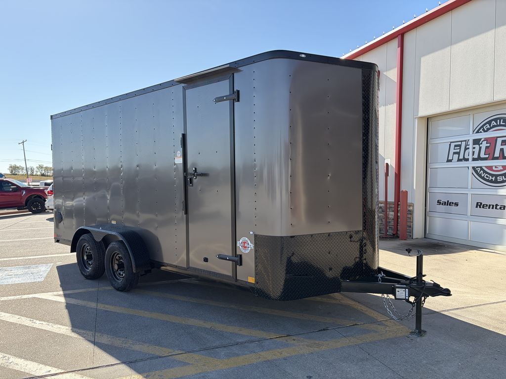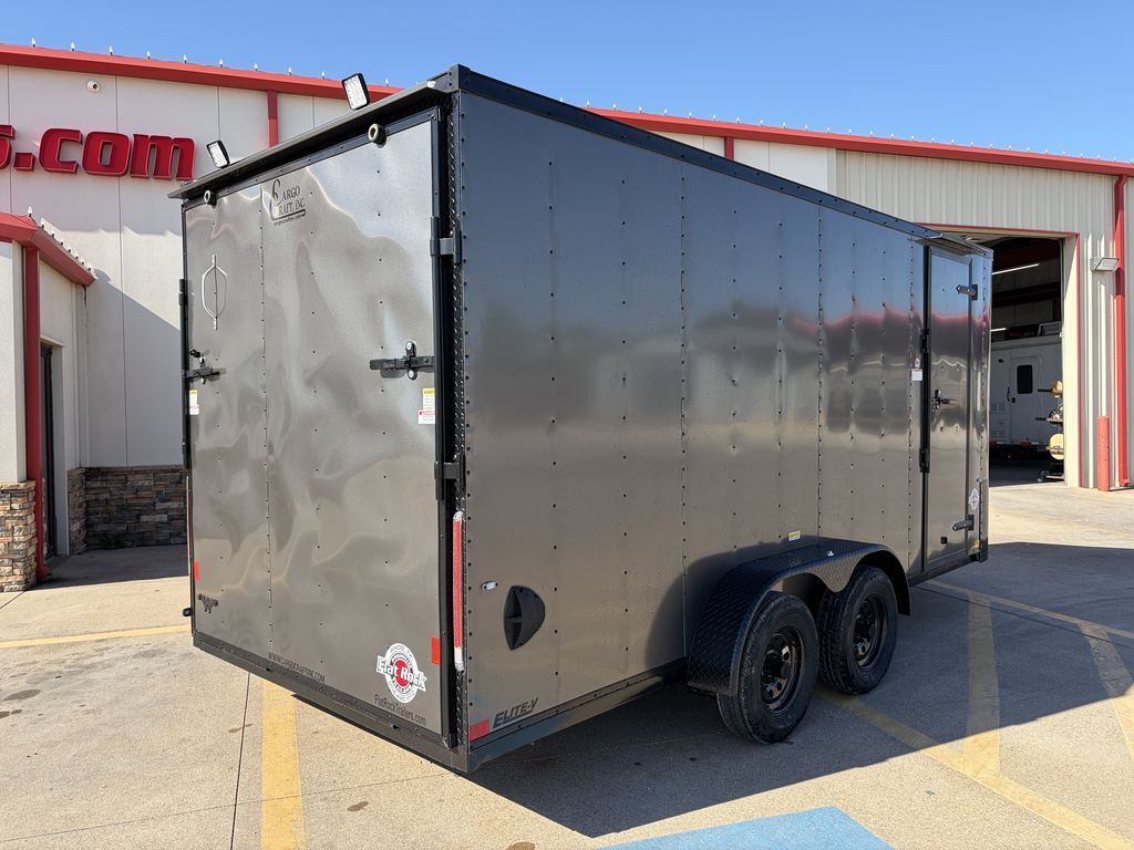 7’ x 18’ Tandem Elite V Nose Cargo 2 x 3,500 lb. EZ Lube 4 in Drop Brake Axles Triple Tongue V Flat Roof System 2 5/16 in Coupler 205 75 R 15 in Radials (Black Mods, Caps, and Lugs) 2K Jack Non Powered Roof Vent Intergraded Hitch Design Stabilizer Jacks (Rear) ATP Post Cover on V 30 in Side Door Upgrade w/ Cam Bar and RV Lock Aluminum Wrap on Rear Door Jambs (Blacked Out) 24 in ATP Front Stone Guard (Blacked Out) ATP Aluminum Fenders (Blacked Out) 7’ Interior Height Spare Tire Mount Spring Assist Rear Ramp Door 3/4 in Gray Sealed Painted Floors 3/8 in Plywood Walls 2 x 12 Volt LED Interior Lights w/ Switch 2 Rear Load Lights Empty Weight: 2,400 lbs. GVWR: 7,000 lbs. Carrying Capacity: 4,600 lbs.