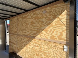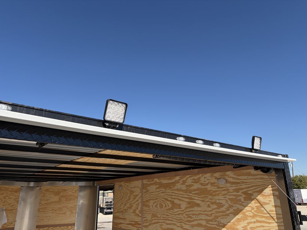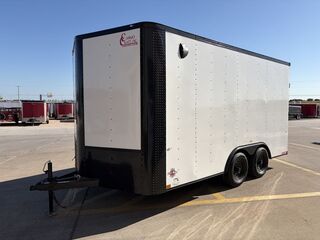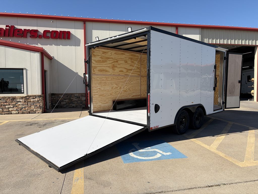 8.5’ x16’ Tandem Elite V Nose Cargo Trailer 2 x 3,500 lb.4 in Drop Brake Axles Triple Tongue V Flat Roof System 2 5/16 in Coupler 205 75 R15 Tires 2K Jack EV Package Includes Intergraded Hitch Design Stabilizer Jacks ATP Post Cover 30 in Side Door Upgrade w/ RV Latch Rear Stabilizer Jacks 24 in ATP Stone Guard 7’ Interior Height Spring Assist Rear Ramp Door 3/4 in Gray Sealed Painted Floors 3/8 in Plywood Walls 2 x12 Volt LED LIghts 2 Rear Load Lights Empty Weight: 2,500 lbs GVWR: 7,000 lbs Carrying Capacity: 4,500 lbs