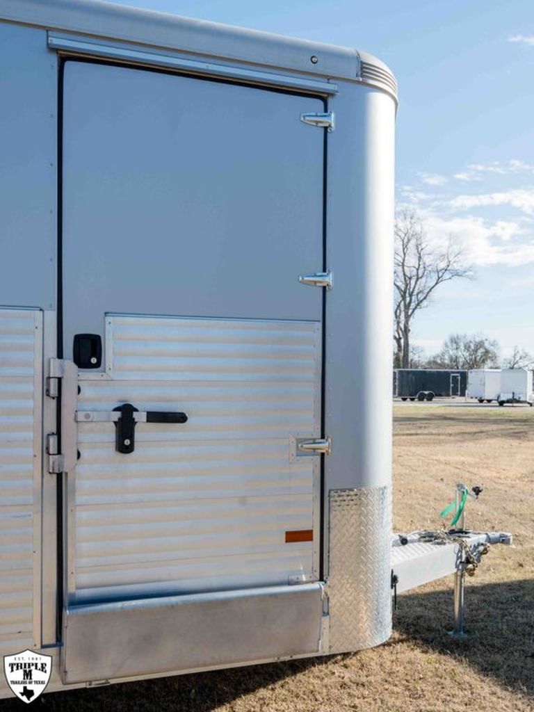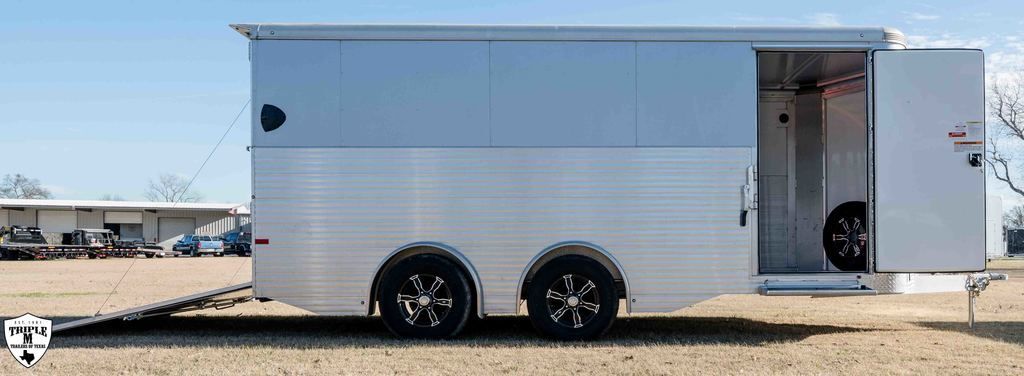 20’ CARGO BUMPER PULL w/ FULL RAMP 20’ FLOOR / 8’ WIDE / 7’ TALL(4) D RINGSALUMINUM FLOORSIDE ACCESS DOOR(2) SIDE AIR FLOW VENTS(2) INTERIOR LIGHTSSPOILER w/ (3) LED RECESSED LIGHTS5200LB TORSION AXLES w/ 16” TIRESSILVER SKINEMPTY = 3,800GVWR = 9,990