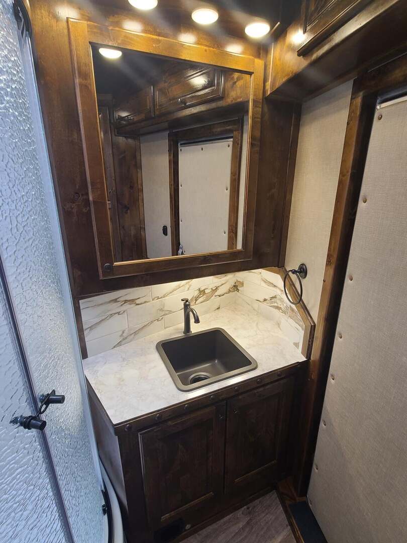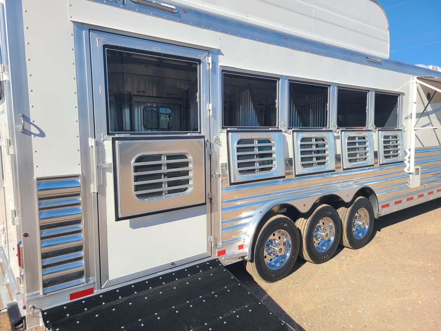 Platinum Coach 5 horse with 14”7” Short wall Outlaw Conversions interior SLIDE OUT with Tri-Fold Sofa and Corner Bench with SIDE LOAD Platinum Coach Features: 8 wide x 37’ long x 8’ tall WERM FLOORING! 70/30 Rear Doors & SIDE LOAD Shelves, bars, hooks and trays in rear tack 4 mangers with escape door at head Drop down window bars on head side Drop down windows on curb side 8’ hay pod & ladder 24” walk through door Baby panel with rubber on first divider Flow through and swing back dividers 2” Blocked axles for additional ground clearance 5 outside halogen load lights 7 tier swing out blanket bar Triple 8,000# axles 17.5” aluminum wheels & 18 ply tires Outlaw Conversion Features: 14’7” short wall 70” tri-fold sofa Corner bench next to slide out 32” SMART TV’S.....WiFi!!!!!!!!!!! Dual-Hydraulic Jacks Dark Knotty Alder raised panel cabinetry Floor and corner cabinetry in nose Onan 4.0 MicroQuiet generator 15,000 BTU A/C & HEAT PUMP 20,000 BTU furnace Electric power awning...NICE!!! TILE BACKSPLASH IN KITCHEN!! 6 gallon hot water heater with Propane heat 40 gallon water tank AM/FM/CD/DVD player with 2 interior and 2 exterior speakers TWO 32” SMART LED flat screens on arm Deep quartz sinks in kitchen and bathroom 2 Hardwood hat racks over R/V door 6.0 refrigerator Recessed 2 Burner cooktop Convection oven with vent hood Extra wide pocket door to bathroom with mirror on bathroom side 32” radius shower w/ bronze glass door & skylight Porcelain toilet with foot flush