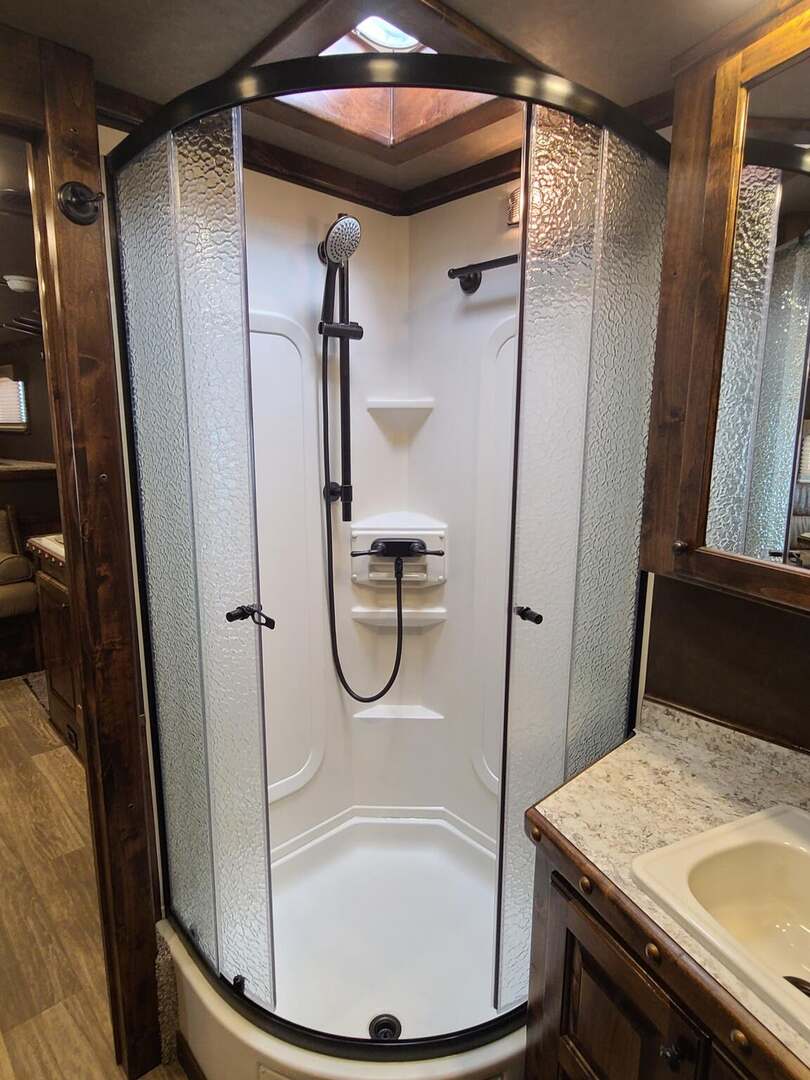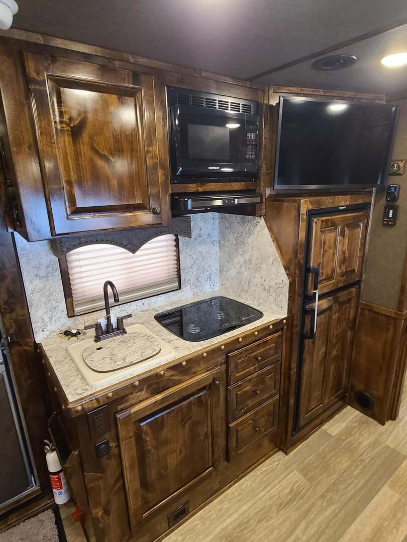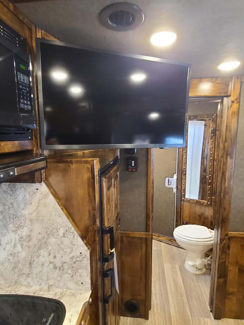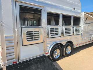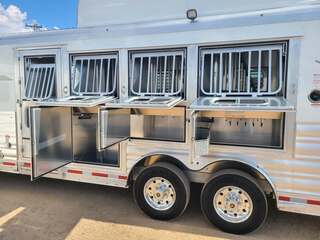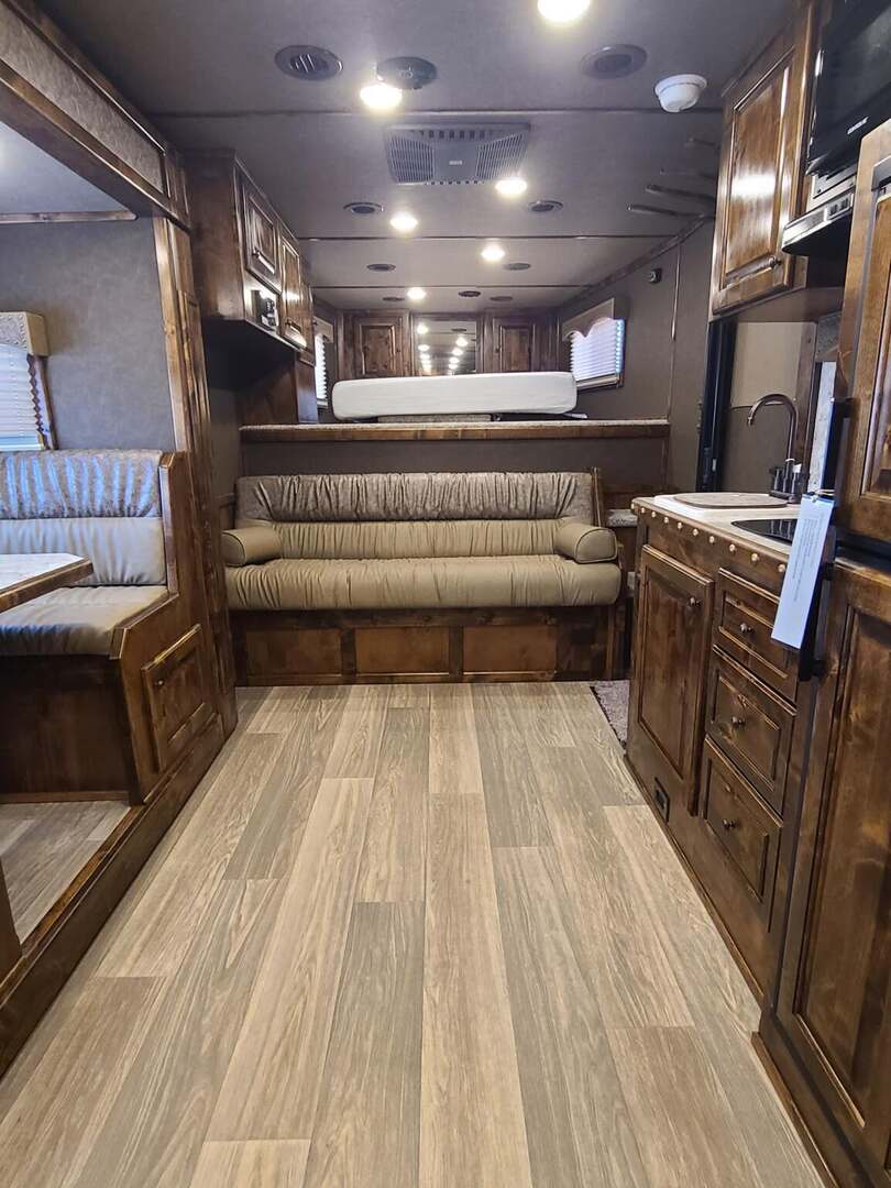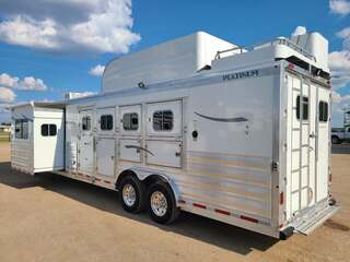 THIS TRAILER IS ON ORDER AND WILL ARRIVE IN APRIL Platinum Coach 4 horse with 14’ Short wall Proline XP by Outlaw Conversions interior SLIDE OUT with 72” Sofa Sleeper and Dinette with SIDE LOAD Platinum Coach features: 8 wide x 33’ long x 7’6” tall 70/30 Rear Doors & SIDE LOAD 3 mangers with escape door at head Drop down window bars on head side Drop down windows on curb side 8’ hay pod & ladder 24” walk through door Baby panel with rubber on first divider Flow through and swing back dividers 2” Blocked axles for additional ground clearance 4 outside halogen load lights 4 tier saddle rack, surrounded by 30 hooks!! 4 tier swing out blanket bar Three shelves in curb side of rear tack area Flow through style steps 10,000# axles 18 ply tires & 17.5” aluminum wheels Flip down 4’ bench  LED load lights Proline XP by Outlaw Conversion Features: 14’ short wall 72” Dinette in 6’ ELECTRIC SLIDE OUT Sofa sleeper at drop wall Dual-Hydraulic Jacks Dark Knotty Alder cabinetry Wardrobe in nose Onan 4.0 MicroQuiet generator on Platform 15,000 BTU A/C with heat pump 20,000 BTU furnace Electric power awning...NICE!!! 6 gallon hot water heater with Propane heat 60 gallon water tank AM/FM/CD/DVD player with 2 interior and 2 exterior speakers 32” LED Smart TV over fridge on door with locking arm Almond kitchen sink &  bronze faucet 2 Hardwood hat racks over R/V door 6.0 refrigerator Glass cover 2 Burner cooktop Microwave oven with vent hood Extra wide pocket door to bathroom 32” radius shower w/ bronze glass door & vent overhead Porcelain toilet with foot flush Mirror next to walk through door