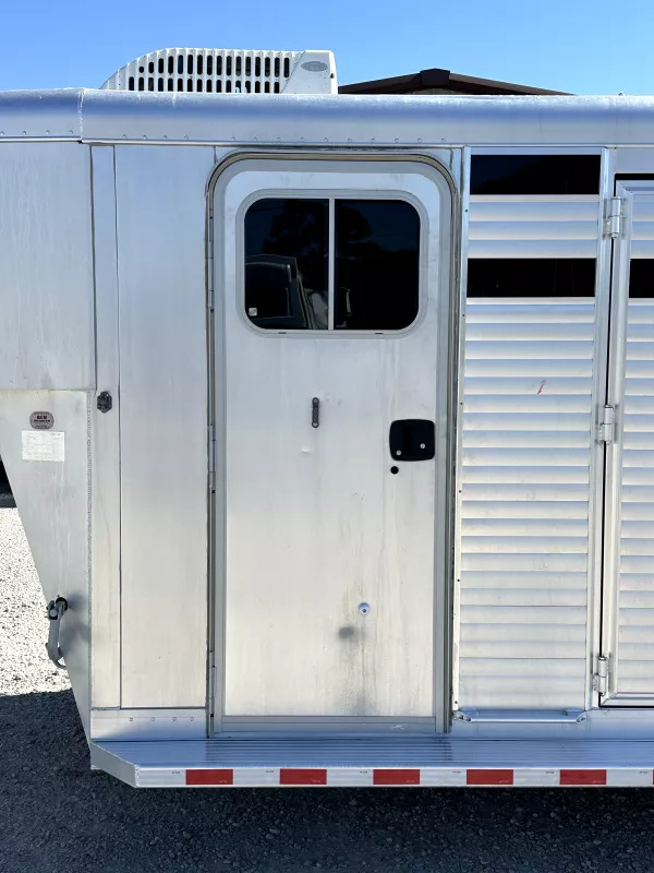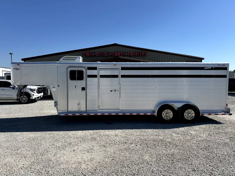 2002 Sooner Stock Combo Gooseneck 24’L x 7’W x 7’T Stock Area - Rubber mats, interior load lights, fully adjustable cut gate w/ swing out door on roller track, escape door, bottom interior tie bar street side, 4 interior tie rings, full rear swing gate w/ slide. Dressing Room - Rubber mats, turf on nose, roof AC, interior lights, (2) 110 AC outlets, lined and insulated walls & ceiling. Other Features - Wheel simulators, full length aluminum running boards, street side exterior bottom tie bar, 10 curb side tie rings, removeable plexiglass, rubber bumper, center leg landing gear, spare tire, curb side ramp. Professionally serviced on 11-6-25 and included the bearings, brakes and lights. Financing available with rates as low as 6.49% WAC - Nationwide delivery also available Call our sales department at 940-365-9919 After hours calls/texts 612-381-6782