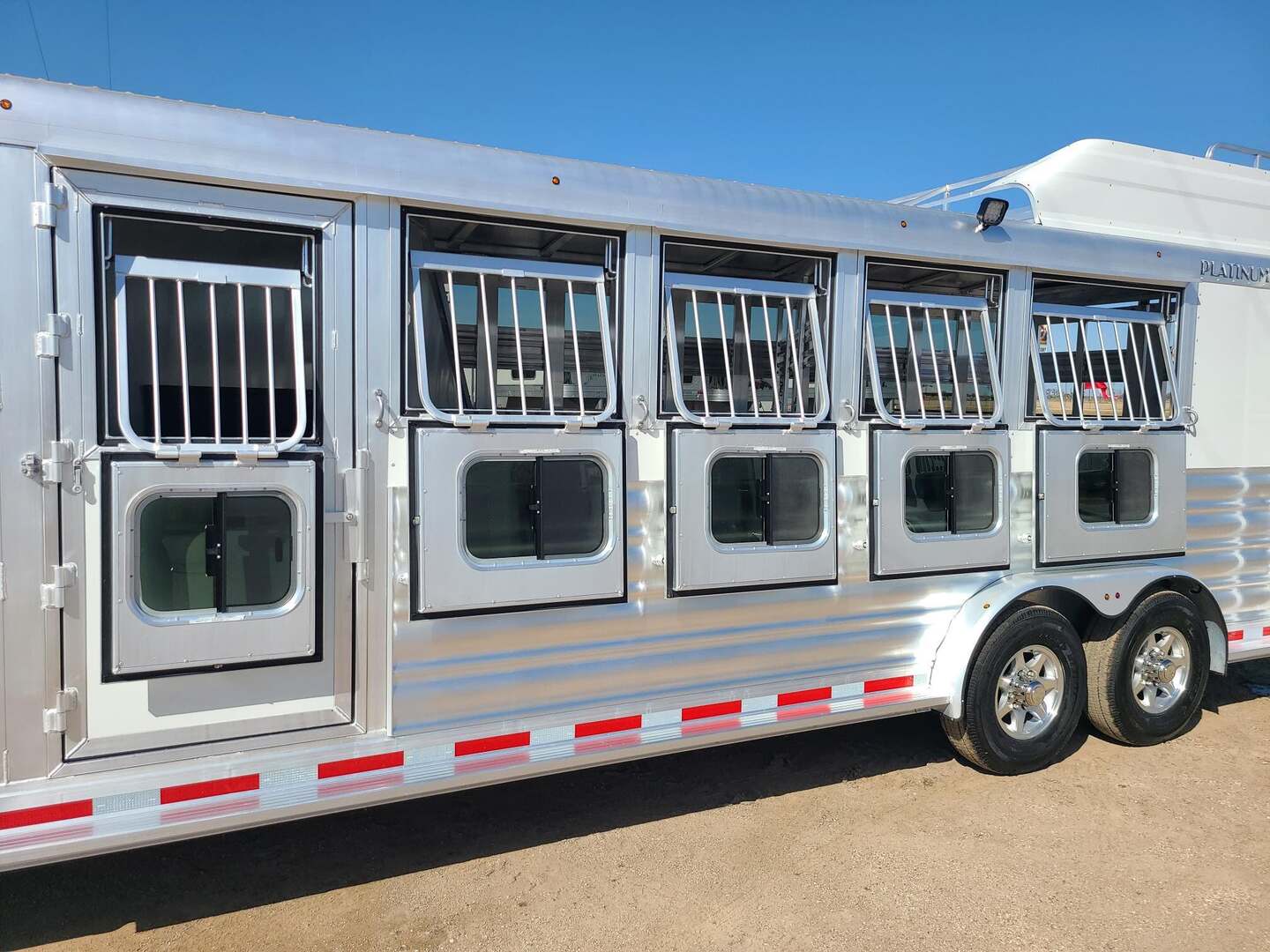 Platinum Coach 5 horse Perfect Trainer / Side Tack!! 7’6” wide x 25’ long x 7 tall Side tack with 6 saddles, 6 bars, 4 brush trays, 30 bridle hooks!!!! Dressing room with boot box, carpet on walls, and hooks on center wall Clothes rod in dressing room nose area, curb side Full width shelf above saddle racks & blanket bars Drop down windows on head side, Plexiglas & track on rump wall Horse divider in first stall with removable baby panel Horse divider on second stall Center gate on third section...haul three behind center gate Glued stall mats on driver and passenger side 3 two-way roof vents in horse compartment...MAX AIR FLOW!! Flow through steps for side tack and dressing room 6’ hay rack 7 round LED clearance lights on top rail 5 LED load lights 7000# axles & 10 ply tires Aluminum 16” wheels Stainless Steel on Nose White Exterior Skin