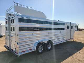 Platinum Coach  4 or 5 horse Perfect Trainer / Side Tack!! 7’6” wide x 25’ long x 7 tall Side tack with 6 saddles, 6 bars, 4 brush trays, 30 bridle hooks!!!! Dressing room with boot box, carpet on walls, and hooks on center wall Clothes rod in dressing room nose area, curb side Full width shelf above saddle racks & blanket bars Drop down windows on head side, Plexiglas & track on rump wall Horse divider in first stall with removable baby panel Horse divider on second stall Center gate on third section...haul three behind center gate Glued stall mats on driver and passenger side 3 two-way roof vents in horse compartment...MAX AIR FLOW!! Flow through steps for side tack and dressing room 6’ hay rack 7 round LED clearance lights on top rail 5 LED load lights 7000# axles & 10 ply tires Aluminum 16” wheels Stainless Steel on Nose White Exterior Skin