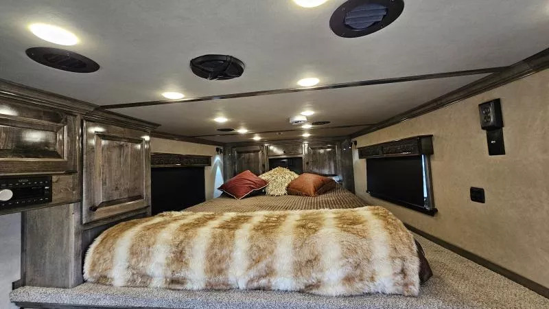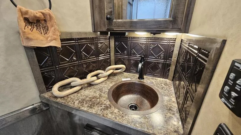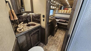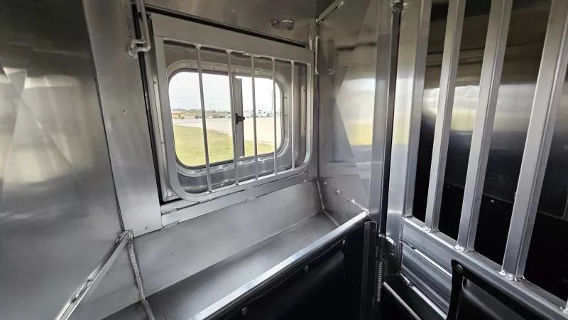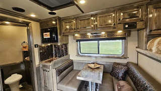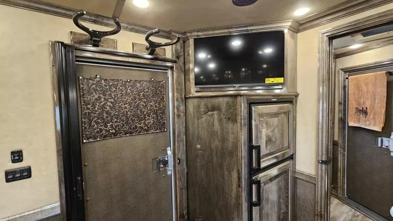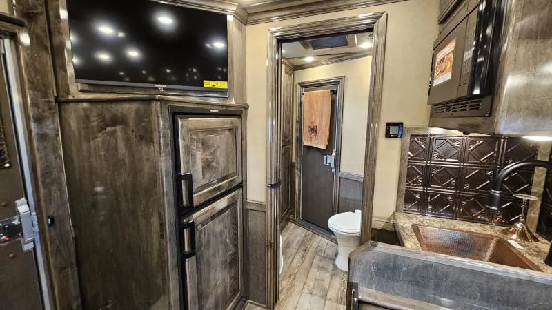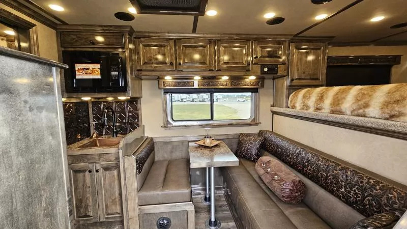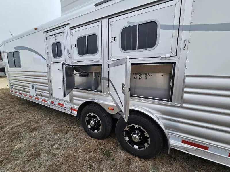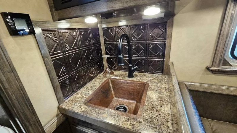 2026 Platinum Coach 3 Horse Living Quarters 10.8 ft SW Side Load Trailer -Hydraulic jack -Aluminum wheels -Stainless steel nose -Electric awning -Drop down windows on head and butt side -Hay pod -Onan 4000 gas generator with remote start -Mangers with access doors -Street side escape door -Big rear tack -LED load lights and saddling lights -3 tier saddle rack -3 tier swing out blanket bar -Flow through dividers -Stud wall -Werm flooring -Walk through door -Jack knife couch -half dinette -32” Smart LED TV - Screen for entry door -Convection microwave oven -Beautiful hand pounded copper-finish sinks -7k axles And much more! Call (512) 746-2515 for more information. Financing and Nationwide Delivery Available!