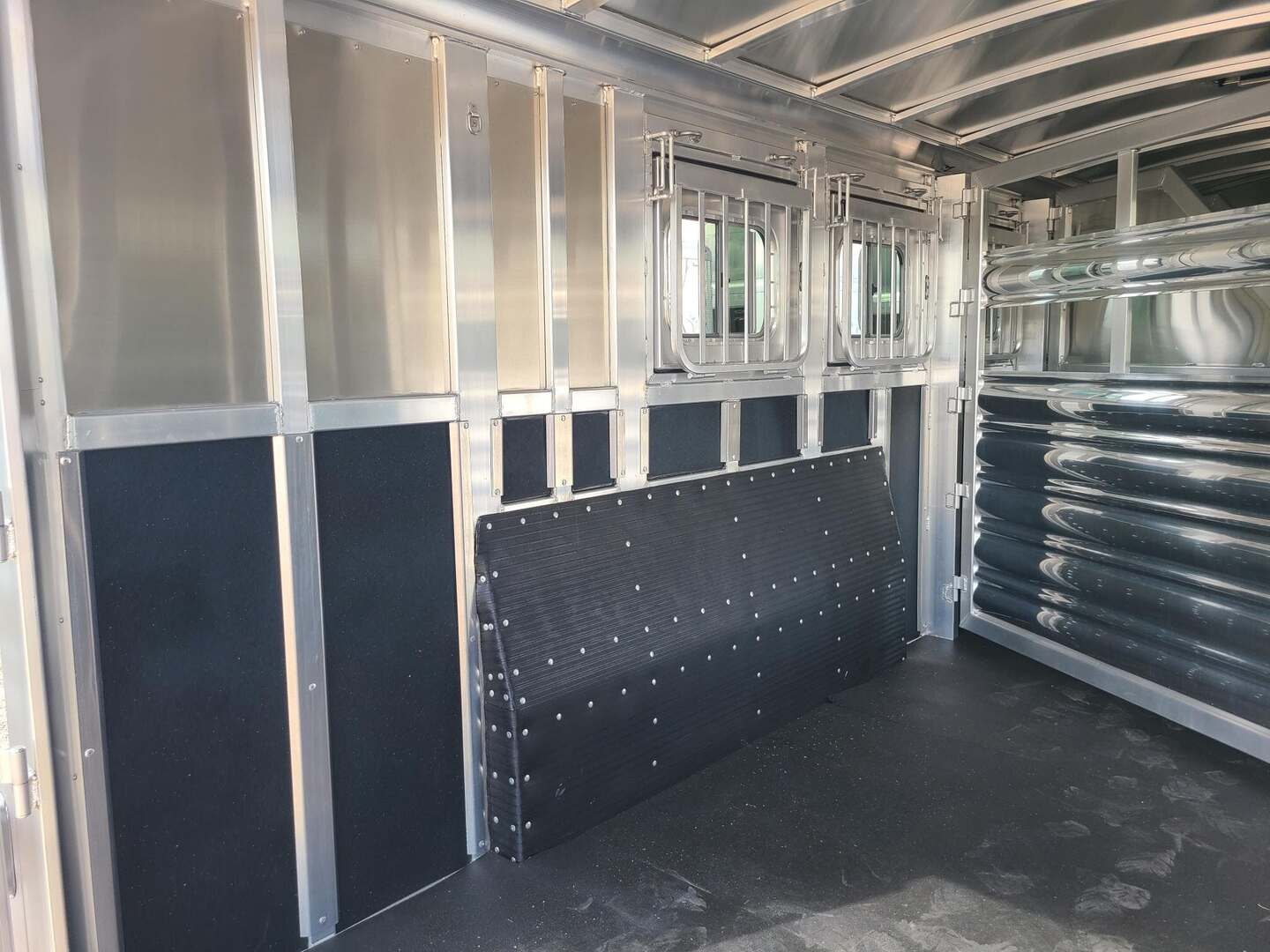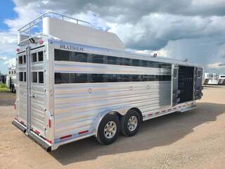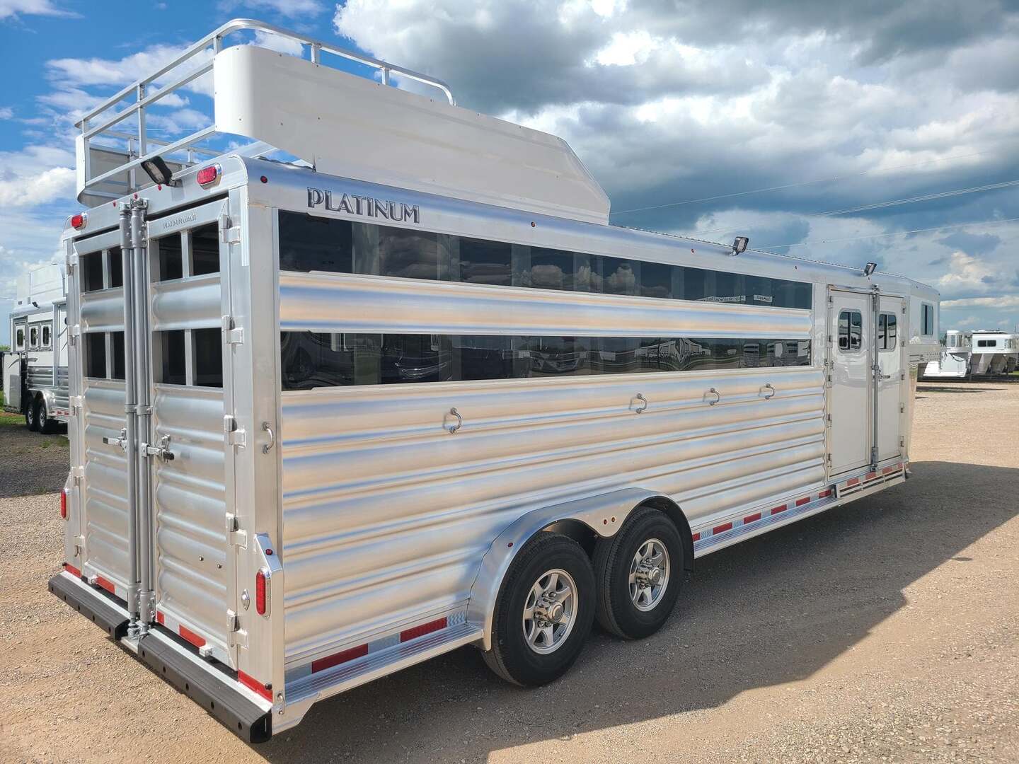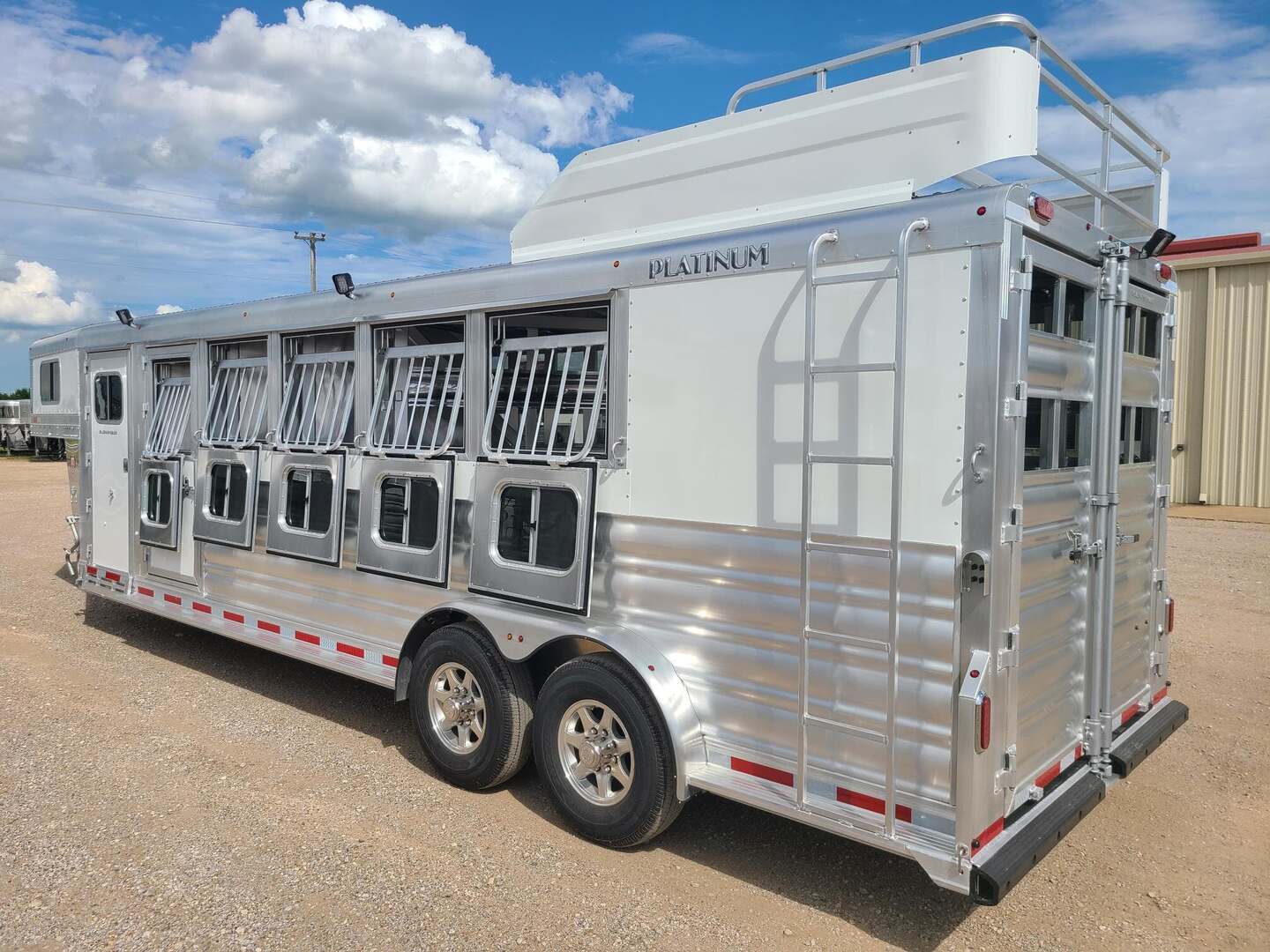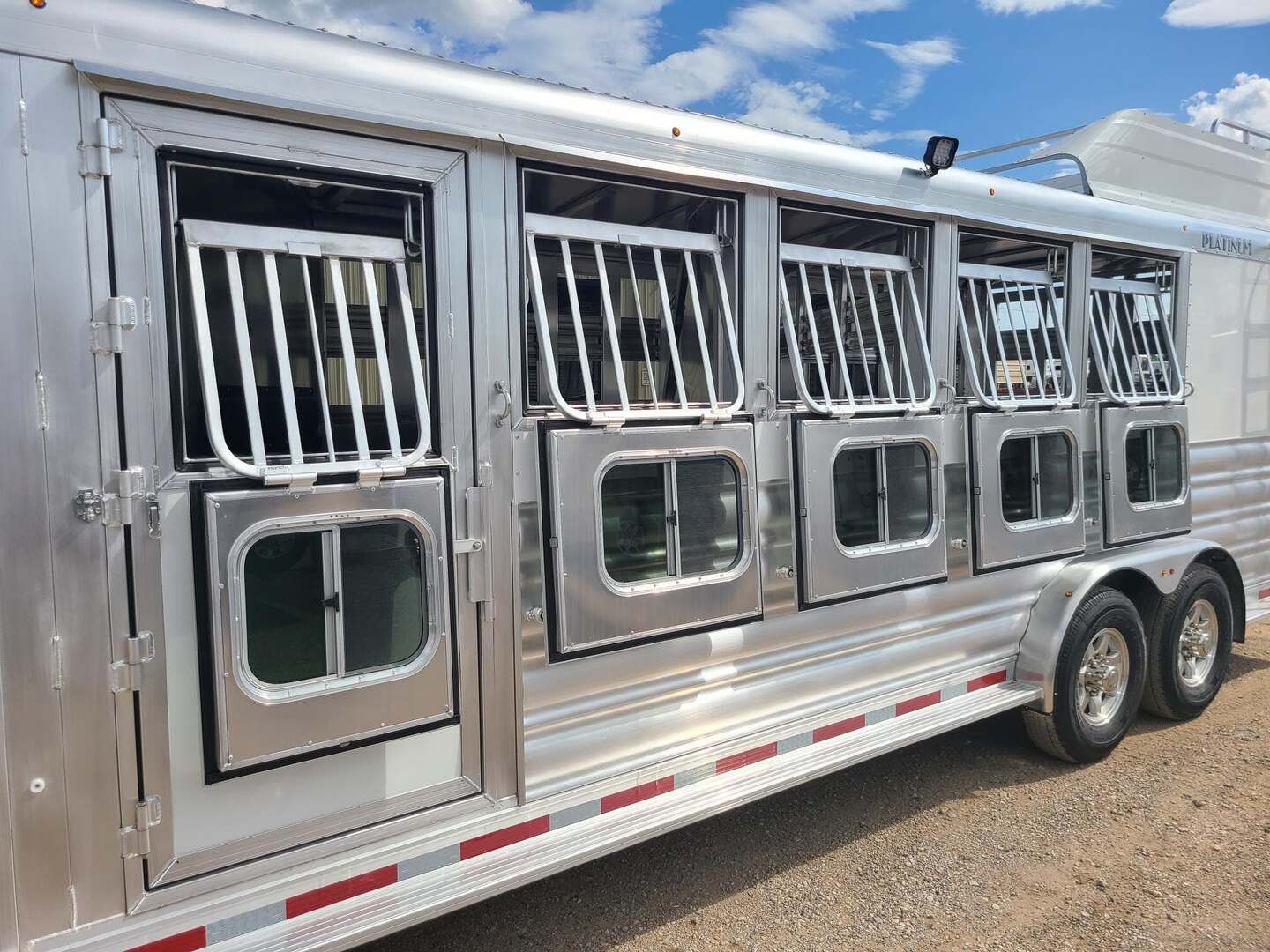 THIS TRAILER IS ON ORDER AND WILL ARRIVE IN FEBRUARY Platinum Coach 5 horse Perfect Trainer / Side Tack!! 7’6” wide x 25’ long x 7 tall Side tack with 6 saddles, 6 bars, 4 brush trays, 30 bridle hooks!!!! Dressing room with boot box, carpet on walls, and hooks on center wall Clothes rod in dressing room nose area, curb side Full width shelf above saddle racks & blanket bars Drop down windows on head side, Plexiglas & track on rump wall Horse divider in first stall with removable baby panel Horse divider on second stall Center gate on third section...haul three behind center gate Glued stall mats on driver and passenger side 3 two-way roof vents in horse compartment...MAX AIR FLOW!! Flow through steps for side tack and dressing room 6’ hay rack 7 round LED clearance lights on top rail 5 LED load lights 7000# axles & 10 ply tires Aluminum 16” wheels Stainless Steel on Nose White Exterior Skin