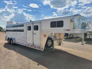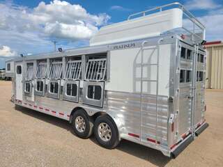 THIS TRAILER IS ON ORDER AND WILL ARRIVE IN FEBRUARY Platinum Coach  4 or 5 horse Perfect Trainer / Side Tack!! 7’6” wide x 25’ long x 7 tall Side tack with 6 saddles, 6 bars, 4 brush trays, 30 bridle hooks!!!! Dressing room with boot box, carpet on walls, and hooks on center wall Clothes rod in dressing room nose area, curb side Full width shelf above saddle racks & blanket bars Drop down windows on head side, Plexiglas & track on rump wall Horse divider in first stall with removable baby panel Horse divider on second stall Center gate on third section...haul three behind center gate Glued stall mats on driver and passenger side 3 two-way roof vents in horse compartment...MAX AIR FLOW!! Flow through steps for side tack and dressing room 6’ hay rack 7 round LED clearance lights on top rail 5 LED load lights 7000# axles & 10 ply tires Aluminum 16” wheels Stainless Steel on Nose White Exterior Skin