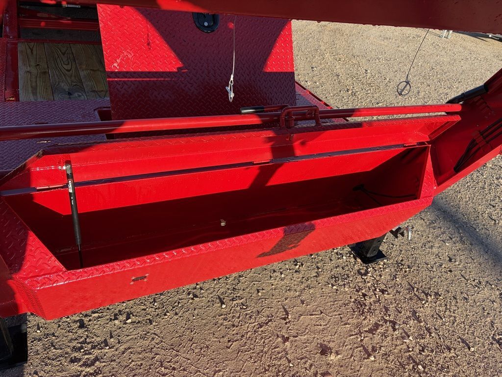Gooseneck2 - 8K Lippert Electric Brake Auto Adjust Oil Bath Torsion AxlesST235/85R16 Tires (14 ply) w/Black Mod Wheels14 Ply SpareWeld on Spare Tire Mount2-5/16” Adjustable GN Coupler (30K)Neckboss 10” Engineered I-Beam Tongue3/8” Grade 70 Safety Chain w/Clevis Hook2 - Side Wind Spring Loaded Drop Leg Jack (12K)Mega Lockable ToolboxIn Deck Storage BoxStandard Stake PocketsPipe Spools3/16” Thick Drive Over Fenders8” I-Beam Frame3” Channel 16” Spacing CrossmembersRub RailGravity TiltAll-Weather Wiring Harness (7-Way RV)DOT Approved LED LightsPine Lumber FlooringPowdercoat Red