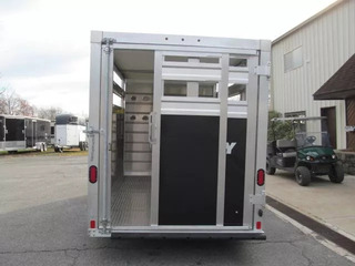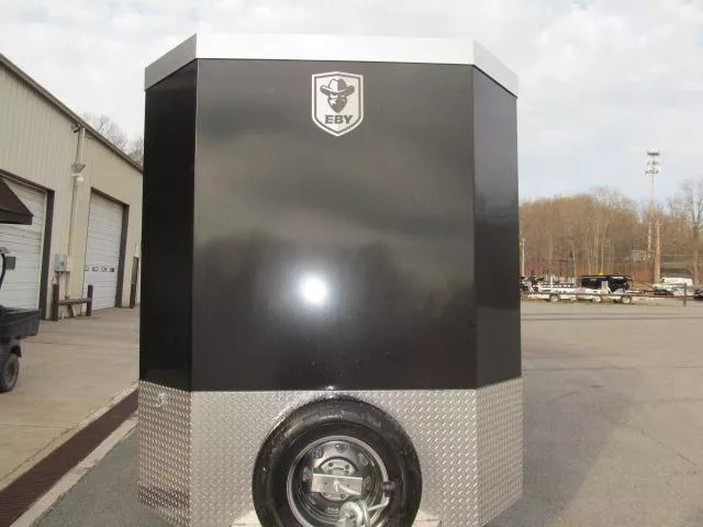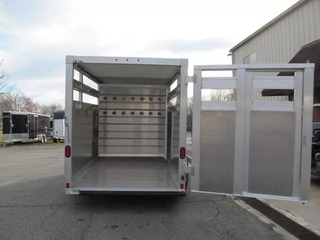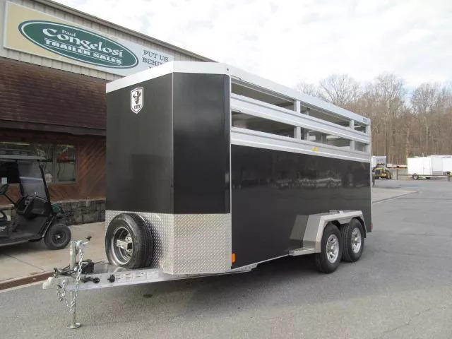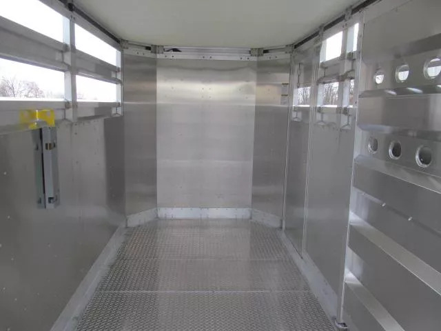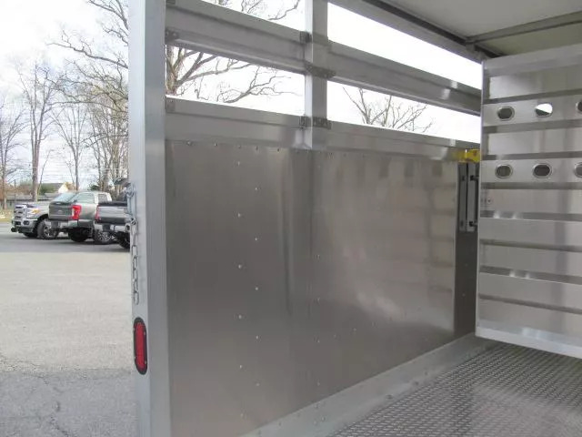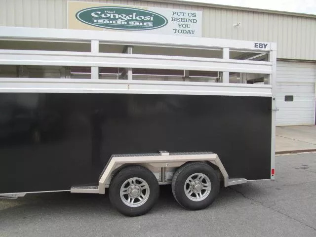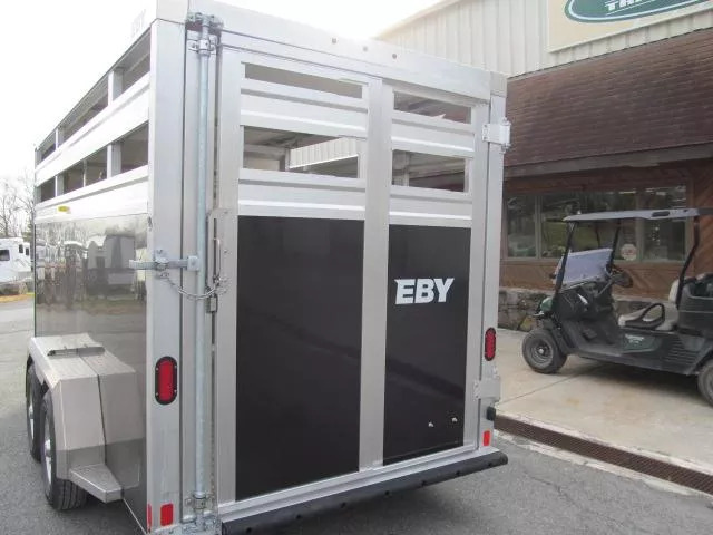 EBY Maverick ’38 Special Bumper Pull Stock Trailer 6’6” Wide 7’ Tall 5.2K Torsion Axles w/ Electric Brakes .115 Flat diamond plate floor 1/2” composite semi-translucent roof Full swing rear tailgate w/ 1/2 sliding pass through door Side door Center Gate Lined lower interior Smooth exterior below slats