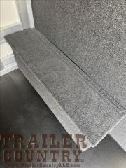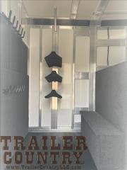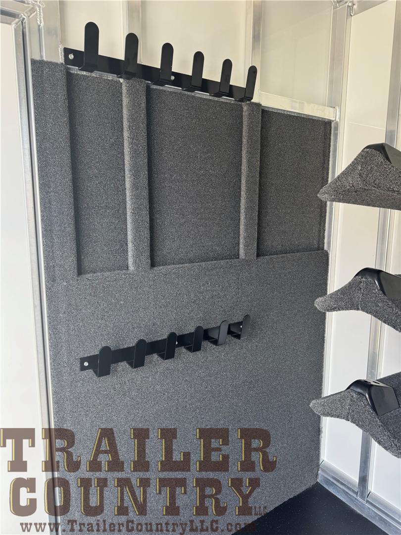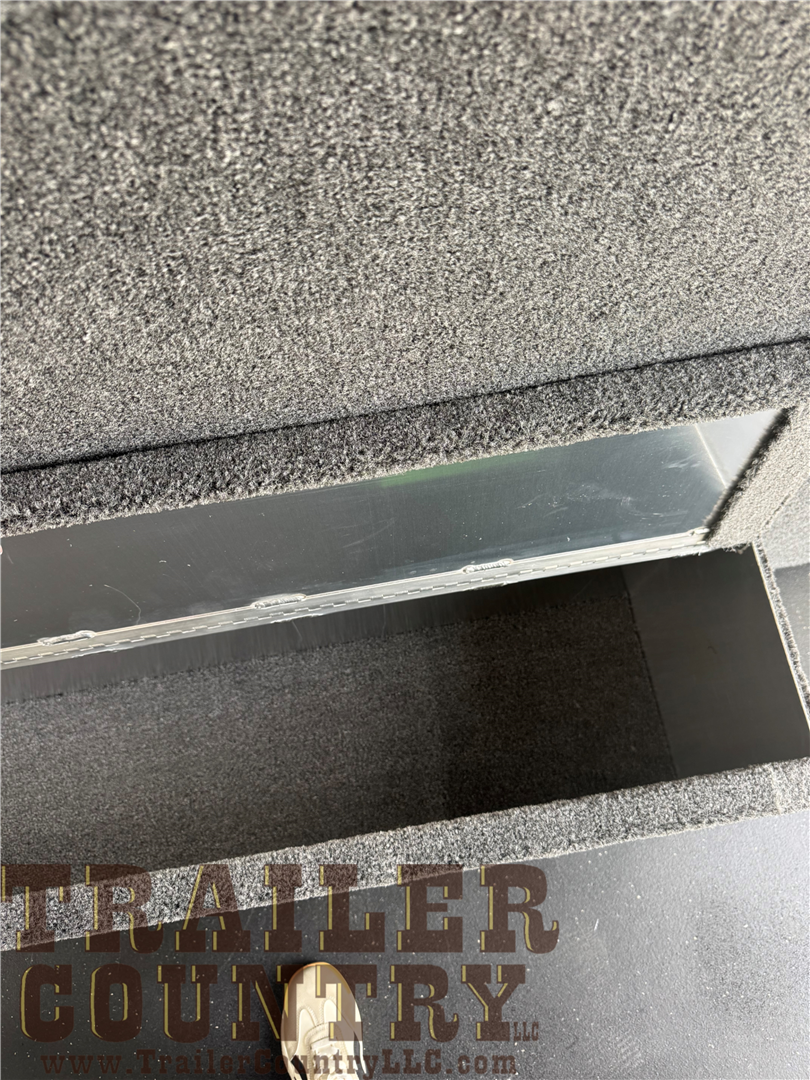 - 5′ dressing room with walk thru door to horse area, 3 saddle racks, blanket pole, brush box, 12 bridle hooks with carpet behind them, flip down step at dresser door, 4′ long x 12″ wide boot box