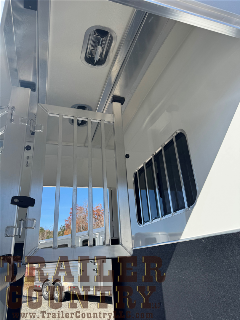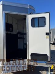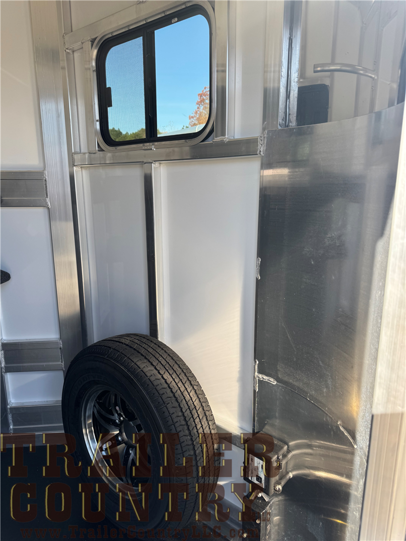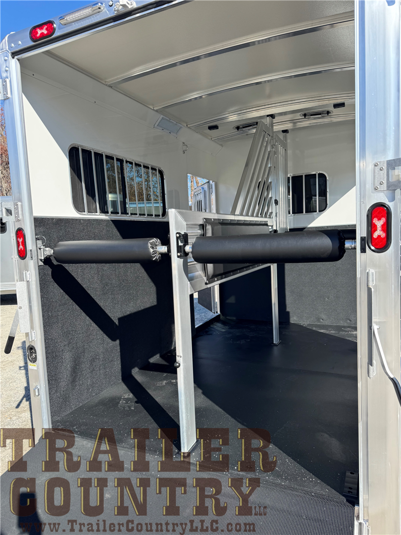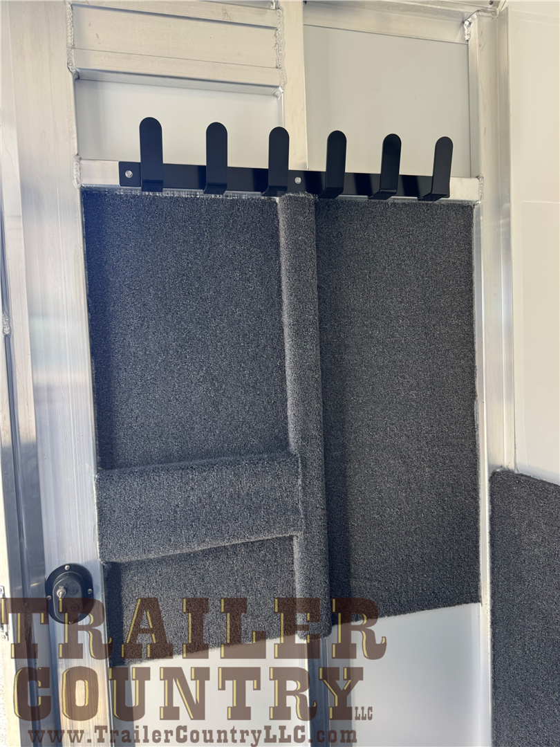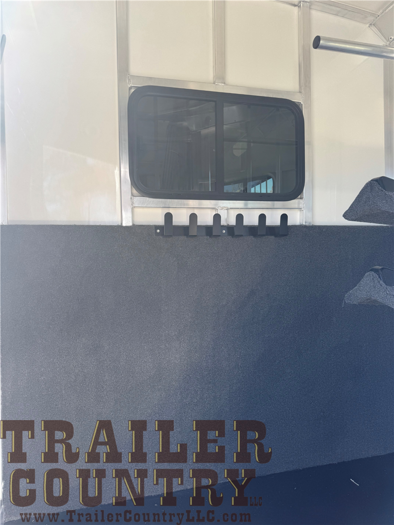- oversized dressing room includes sliding windows in the nose, heavy duty dresser door, mats on dresser floor, 2 adjustable saddle racks, 12 bridle hooks, blanket pole, clothing bar, brush tray on dresser door, sliding window between horse area and dressing room