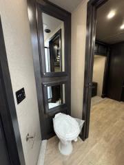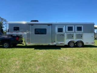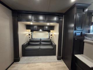 Living Quarters has a stainless steel appliances, solid wood cabinets, convection microwave, 6 cu ft refrigerator, Queen size bed, sofa that also turns into a bed, two burner stove top, sink, Bluetooth radio with inside and outside speakers. There is a separate bathroom with radius shower, toilet, sink with vanity and wardrobe closet. All of this with the convenience of Dual Propane tanks, Hydraulic jack and a Electric Awning.