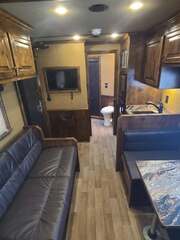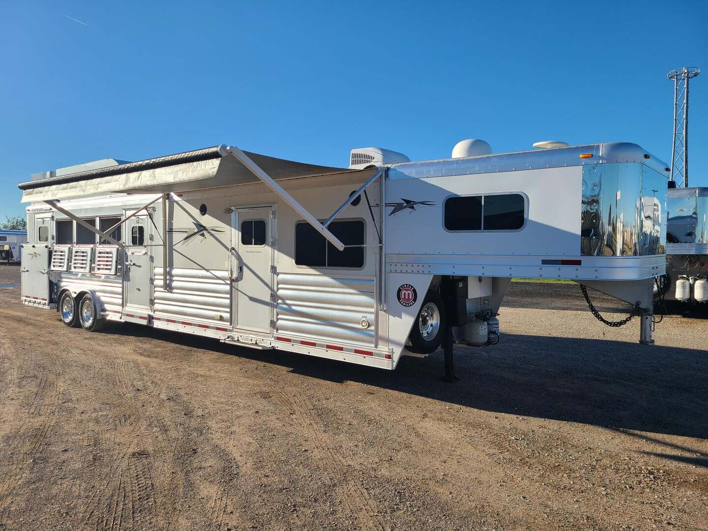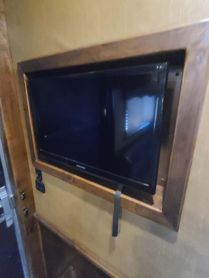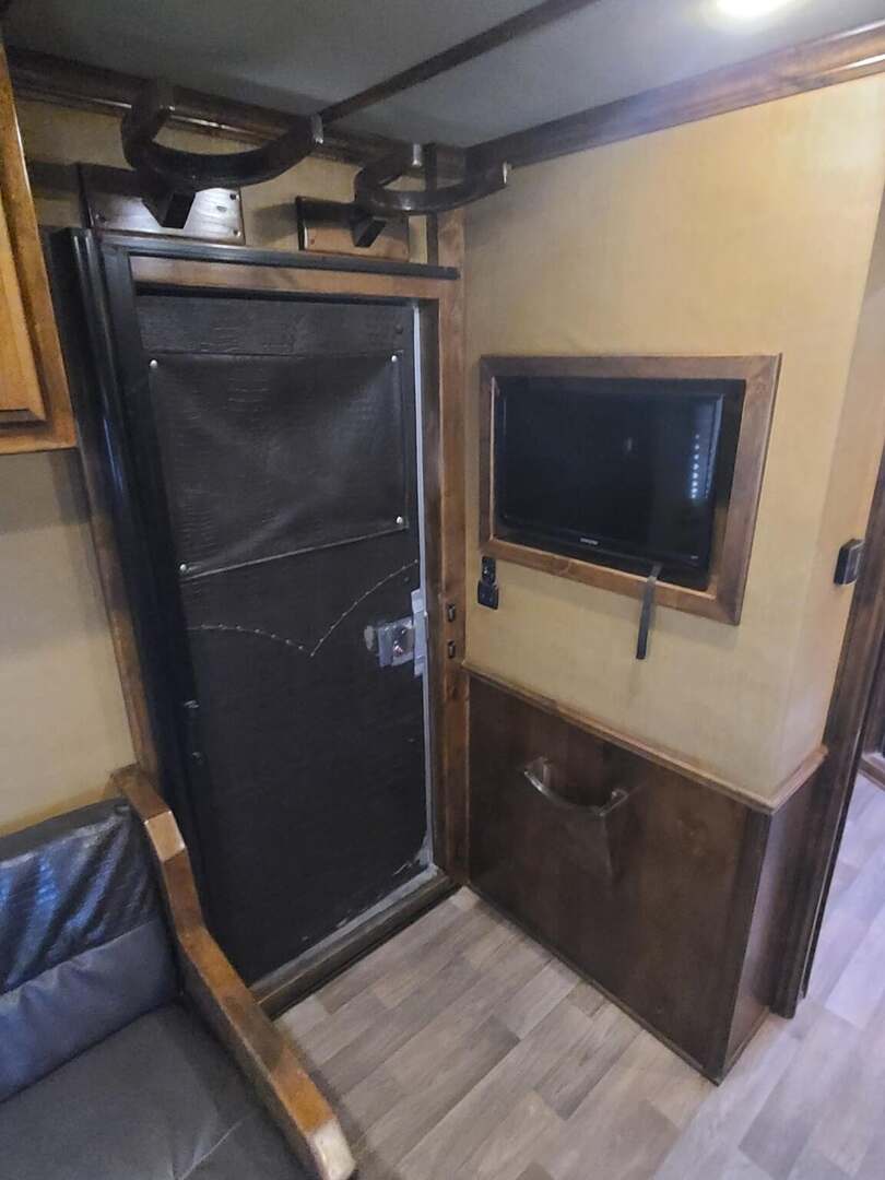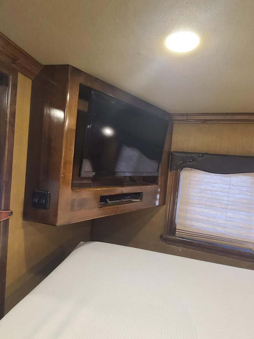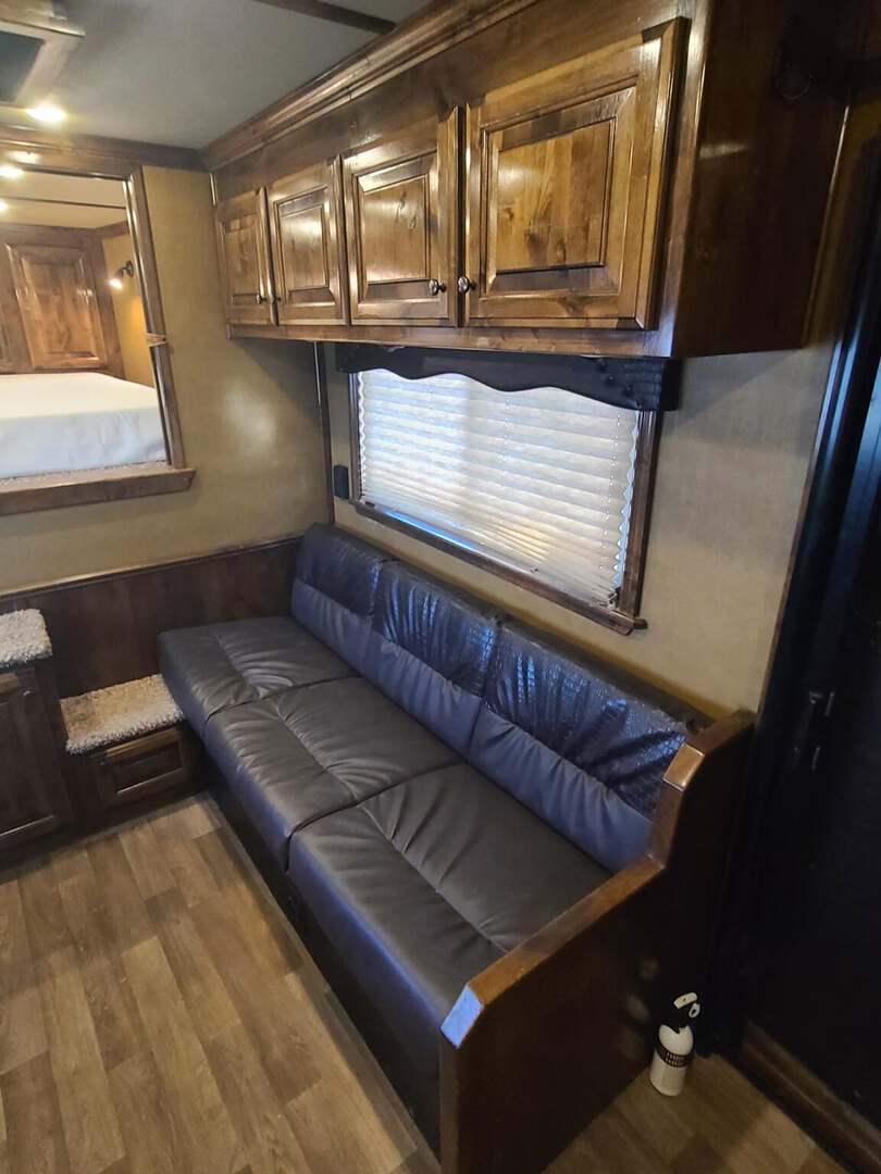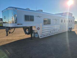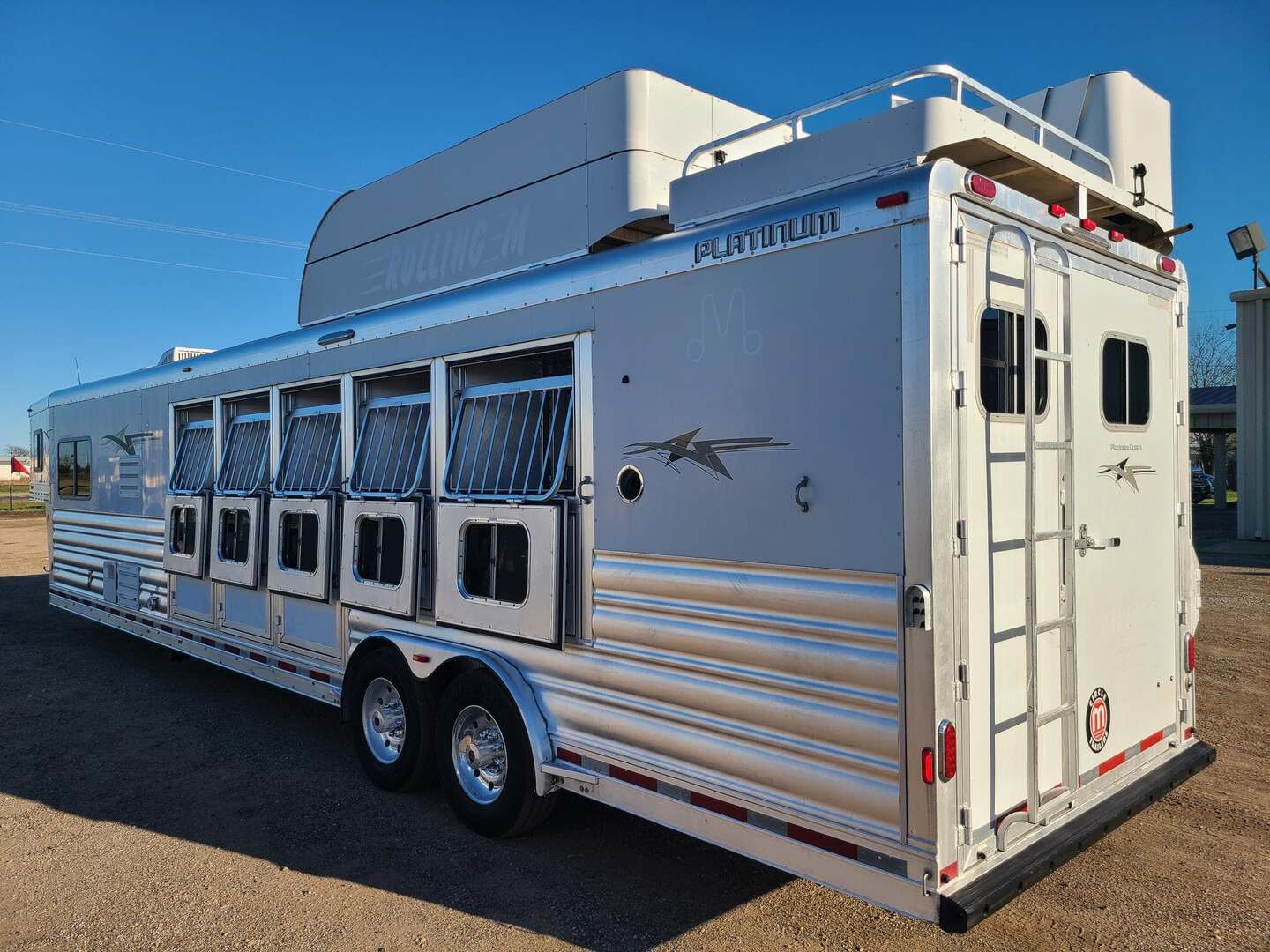 Platinum Coach 5 horse with 12’8” Outback Conversion Outback Conversion features: NEW Onan 4.0 generator, only 62 hours Couch and dinette configuration Sinks in kitchen and bath NEW 15,000 BTU A/C with heat pump 16,000 BTU furnace NEW 6.0 propane / electric refrigerator 6 gallon water heater 60 gallon water tank Two 24” TV’s one in living, one bed area AM/FM/CD/DVD player with 2 exterior speakers 14’ Dometic power awning with aluma guard cover 32” radius shower with power vent overhead NEW Toilet in front of vanity / sink area Large closet in bath area Two hat racks over door  24” walk through door to horse compartment Single leg hydraulic jack Double aluminum battery box Two 20# propane bottles Platinum Coach features: 8 x 35 x 7’6” tall Side load configuration LOADED rear tack with all the accessories you need! 5 mangers, escape door on rump wall Drop down windows head and hip Drop down window bars on head side Flow through dividers Stud divider on first stall WERM flooring 8’ enclosed hay pod  Two 8k axles, 17.5 Continental tires, Alcoa Aluminum wheels