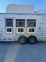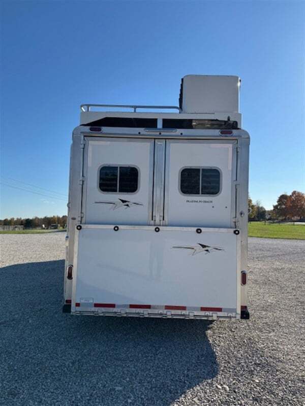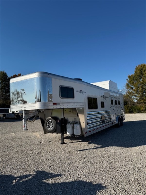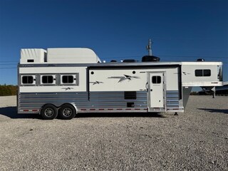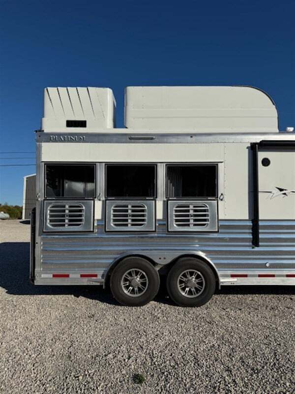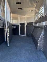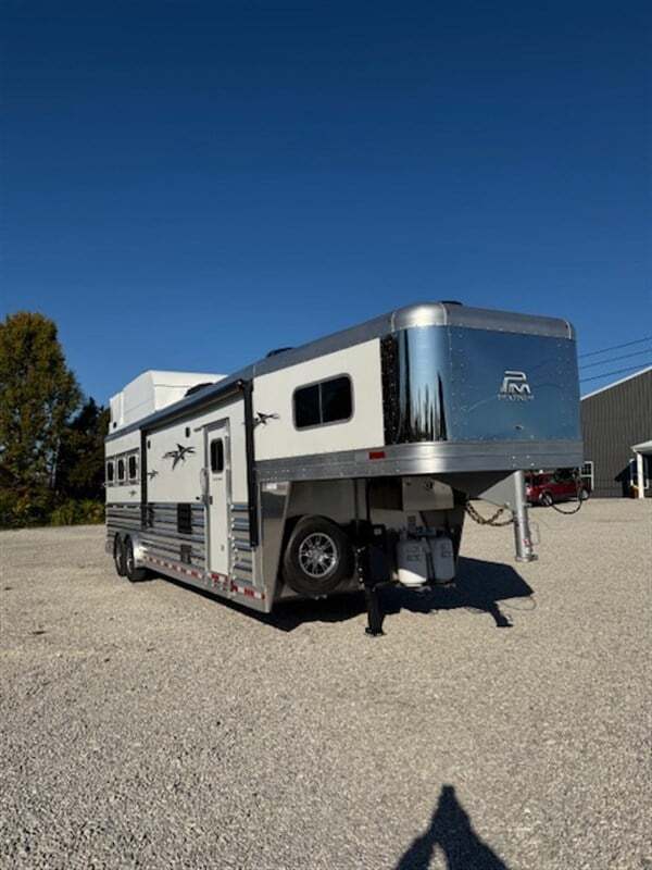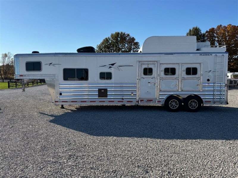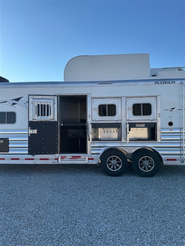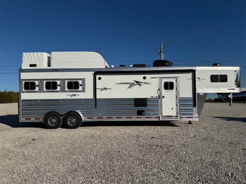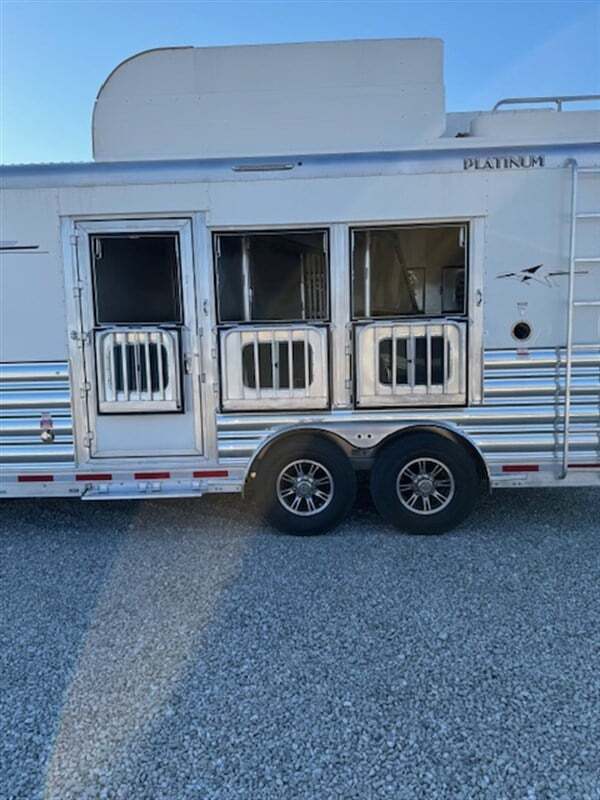 2016 PLATINUM 3H WITH 13’ SHORT WALL OUTLAW CONVERSIONS LQ 8’ Wide x 27’ Long x 8’ Tall LIVING QUARTERS FEATURES: Onan 4.0 Microquite Gas Generator Power awning with metal weather shield and LED lights AM/FM/CD/DVD/MP3/App/Sat Ready (2) Interior and (2) exterior speakers 32” LED flat screen smart TV Connect 2.0 WiFi, 4G, OTA, AM/FM (2) 12v USB Cell phone outlets (2) Interior courtesy lights (2) Exterior courtesy lights Lighted grab handle at LQ door Exterior porch light at LQ door Folding screen door Power roof vent with fan above shower Power vent hood above cooktop Recessed mirror in pocket door 7.0 Cu ft LP/120v refrigerator 2-Burner recessed cooktop with flush mount glass cover Microwave oven 7 Drawers 10 Gallon LP/120v water heater with electric start 60 Gallon fresh water tank Exterior water faucet under nose (2) 30 lb LP tanks with auto change over 15,000 BTU ducted air conditioner with heat pump 20,000 BTU ducted LP furnace Bathroom vanity with medicine cabinet and mirror 32” Radius shower with sliding door 72” Pull out sofa sleeper Half dinette with removable table Day and night pleated window shades Snap cover over LQ door window Outlaw flex queen mattress (2) Spot reading lights above bed Walk thru door from bathroom to stall area Light switch for stall area lights on bathroom wall TRAILER FEATURES: (2) 7,000 lb Dexter rubber torsion axles 4-Wheel electric brakes Axles blocked 2” and gooseneck raised 2” to allow for greater clearance between truck bed and gooseneck (5) 235/85R 16” 14 ply tires with 4,400 lb load capacity each and 81 mph speed rating (5) 8 Hole aluminum wheels 12,000 lb Single leg hydraulic jack WERM flooring in horse area and rear tack Horse area walls and ceiling are lined and insulated 2-Way roof vent above each horse Aluminum battery box Haypod with enclosed lid Generator compartment mounted on roof with platform Full with spring loaded rear ramp 50/50 Rear doors Stainless steel nose Round LED clearance lights Additional clearance lights on each top rail (3) LED exterior load lights (25) Bridle hooks (2) Brush trays (3) Tier removable saddle rack Collapsible rear tack Spring loaded dividers 1st stall divider is full to top and bottom with flow thru bars at hip Bottom divider is rubber lined on both sides Rear divider is telescoping Escape door at head of 1st stall stall  Drop down feed door with separate drop down window bars at head of each stall Drop down door at rear of each stall Manger with exterior access door at 2nd and 3rd stalls Fold up flow thru step at escape door and LQ door Camper door latch and butter fly latch at escape door MSRP: $178,013.00 SHININ’ B PRICE: $148,500.00 Financing Available with approved credit...Delivery Available