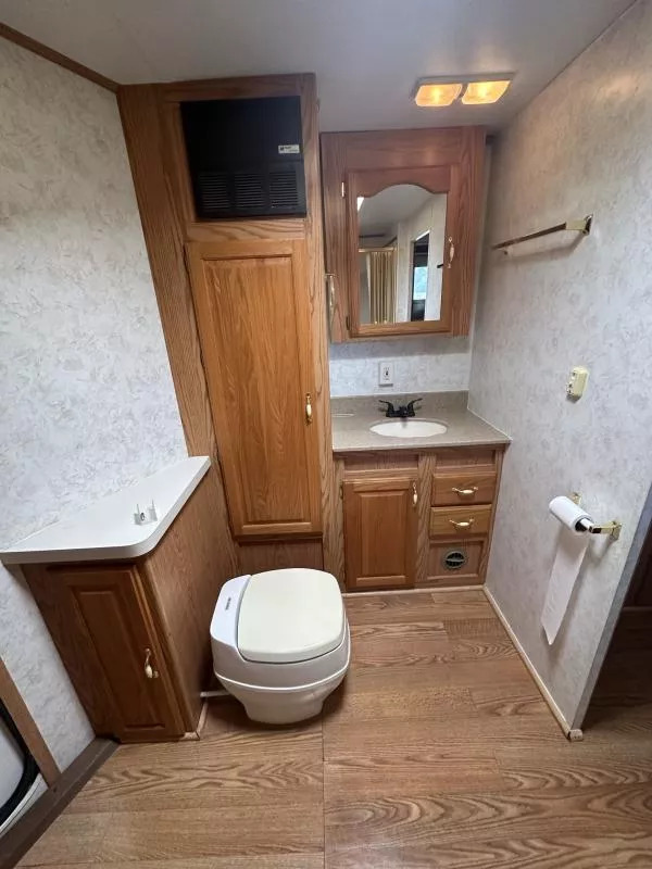 Bathroom Features - Swinging privacy door w/ full body mirror, toilet, shower, hand wash sink, mirror medicine cabinet, large wardrobe closet, 110 outlets, drawers, crank up roof vent.