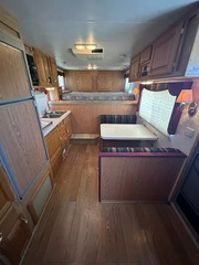 Kitchen Features - dinette table, dual reading lights above dinette, dual well stainless steel sink, 2 burner cooktop, microwave, vent hood w/ fan, 110 outlets, cabinets, drawers, full-size fridge, furnace, wardrobe closet, digital fluid monitor.