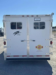 Horse Area - rubber mats, kick pads, lined and insulated walls, mangers, 3 drop-down windows w/ folding face guards (head side), sliding bus windows (hip side), spring loaded solid dividers w/ slam latches, stud divider, 4 pop up roof vents, 4 interior load lights, escape door, padded butt and chest bars, 2 tie rings per stall, folding and removeable rear tack w/ 4 tier carpet covered removeable saddle rack, interior rear tack light, aluminum brush box, folding blanket bar, 12 bridle hooks.
