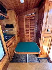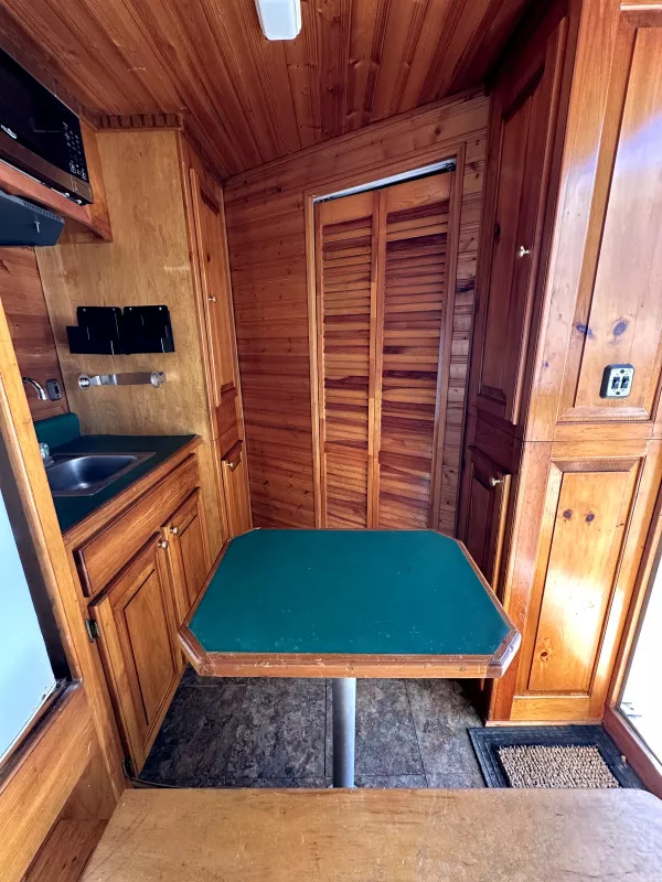 Kitchen Features - removeable table, 3 cubic foot mini fridge, boot box bench, stainless steel sink, microwave, cabinets, 110 outlets, wardrobe closet, pantry cabinet.