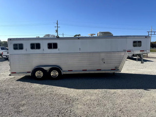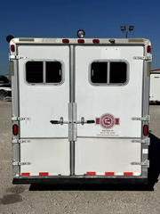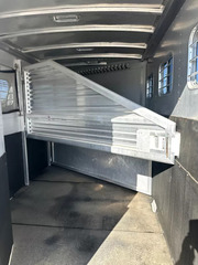 Horse Area - Rubber mats, kick pads, lined and insulated walls, 3 drop down windows with removeable nylon screens (head side), sliding bus windows (hip side), solid dividers, 1 stud divider, 2 interior load lights, 3 pop up roof vents, 2 tie rings per stall, 18 aluminum bridle hooks in first stall, padded butt bar, folding and removeable rear tack w/ 4 tier carpet covered removeable saddle rack, 24 bridle hooks, brush box, 2 folding blanket bars, 1 interior rear tack light.