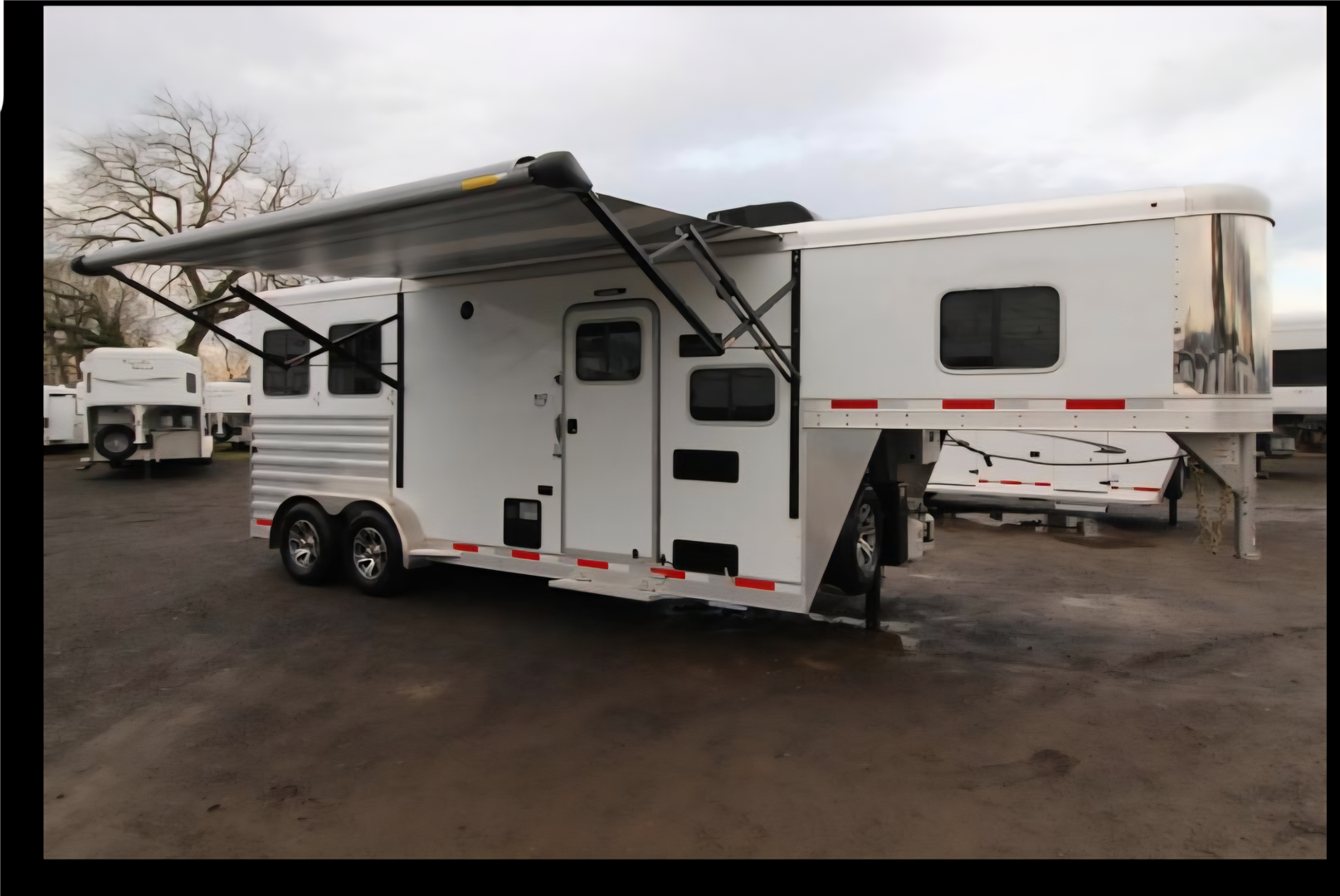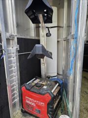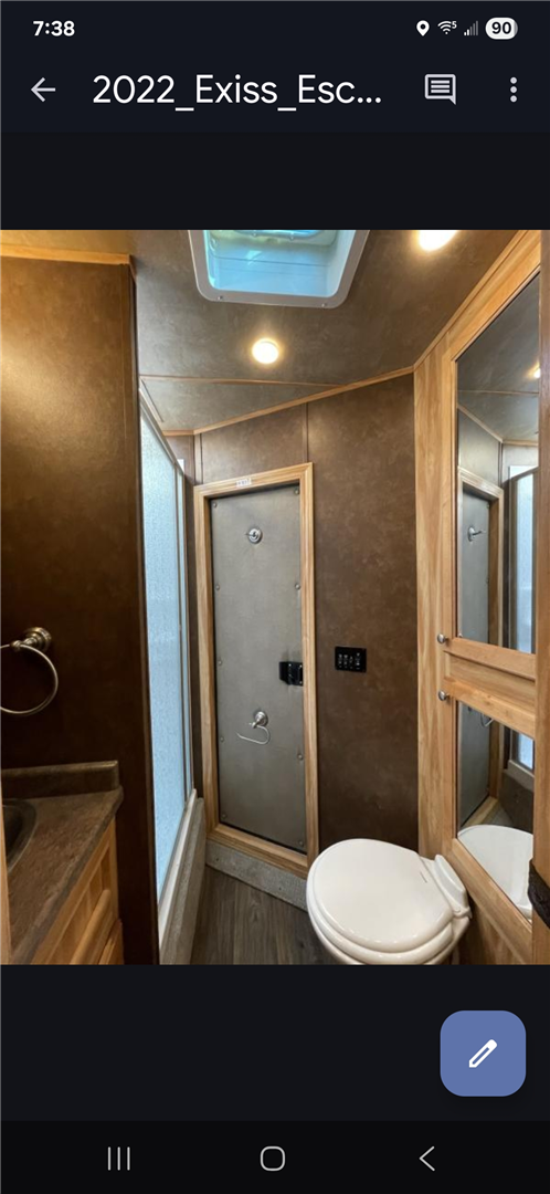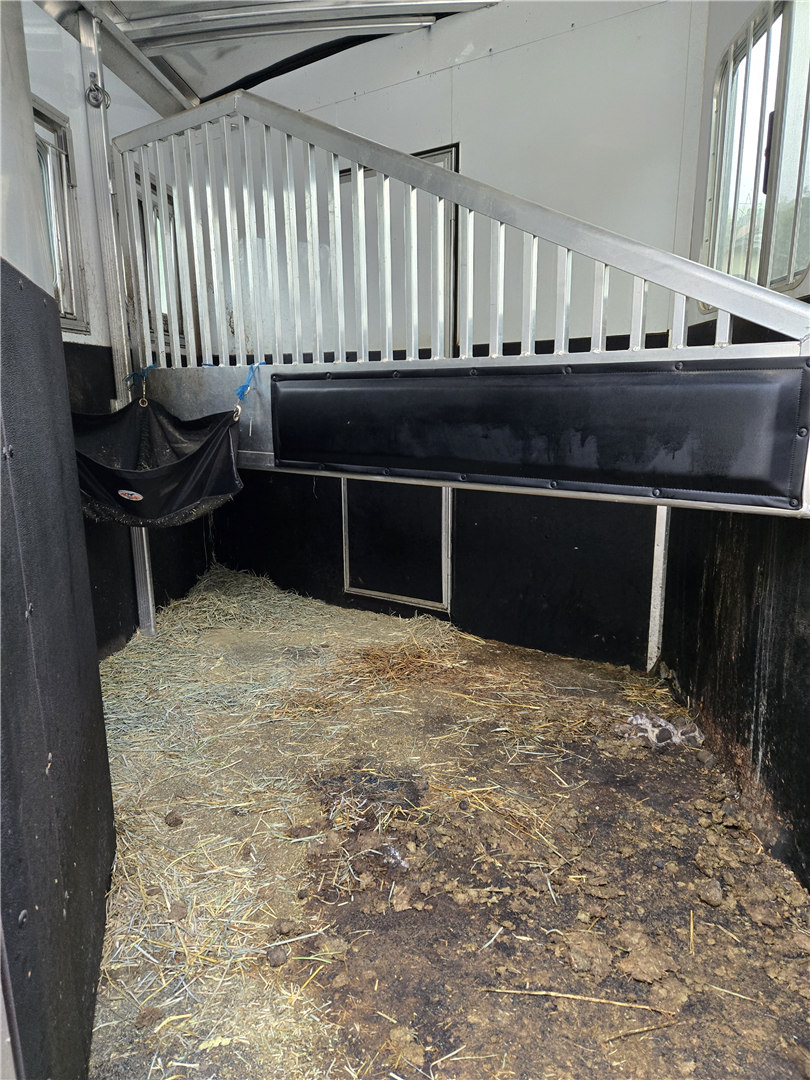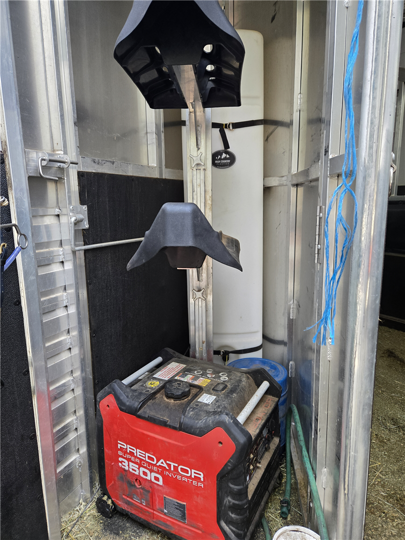 Fully loaded. Easy care porous flooring which drains. 40 gal High Country water in tack room. 2 horse swing saddle rack. Drop down doors with bars and screens. Canvas manger, Floor to ceiling fridge. AC. Stereo. Light cabinets. Microwave. Stove. Bathroom vanity. Glass door shower. Brand new never used TV. Electric hitch. Aluminum rims. Electric awning with lights. Optional generator $700 more. 20 volt solar so most of not much need for the generator.