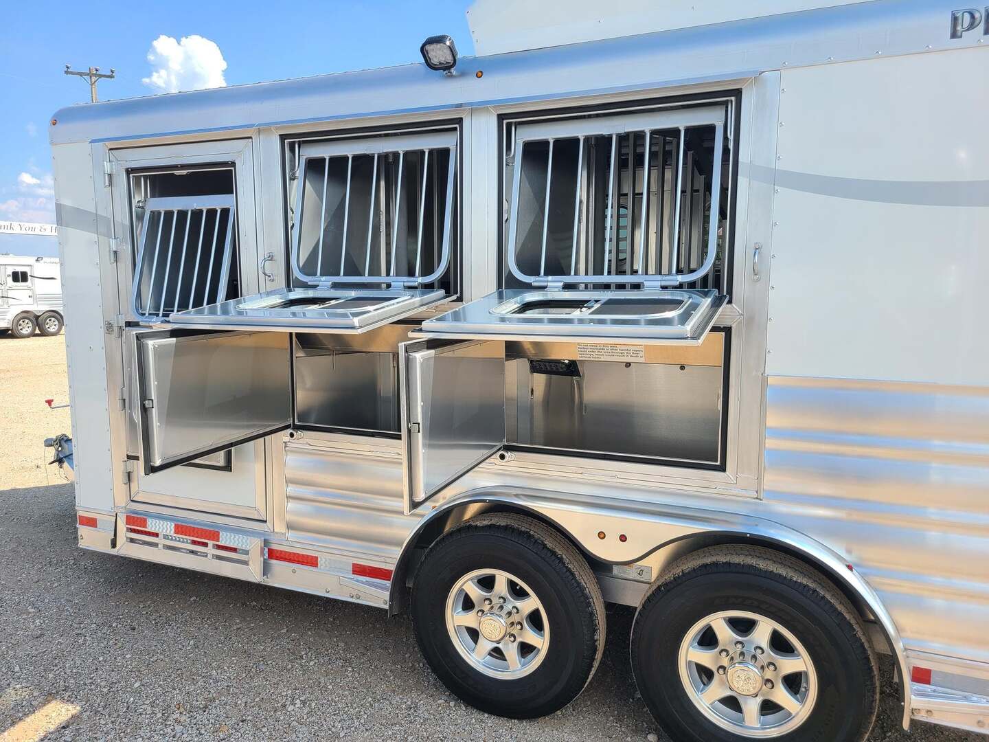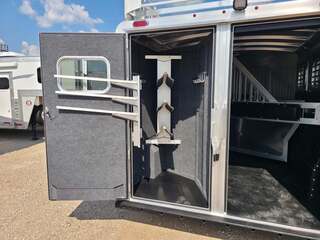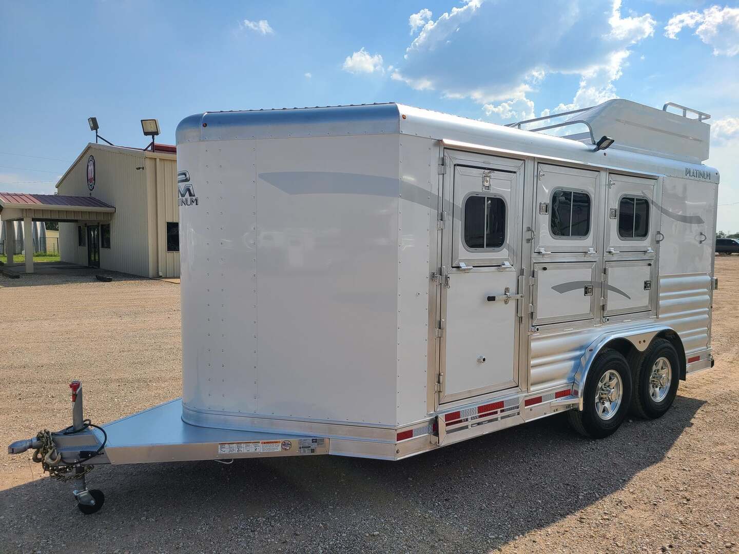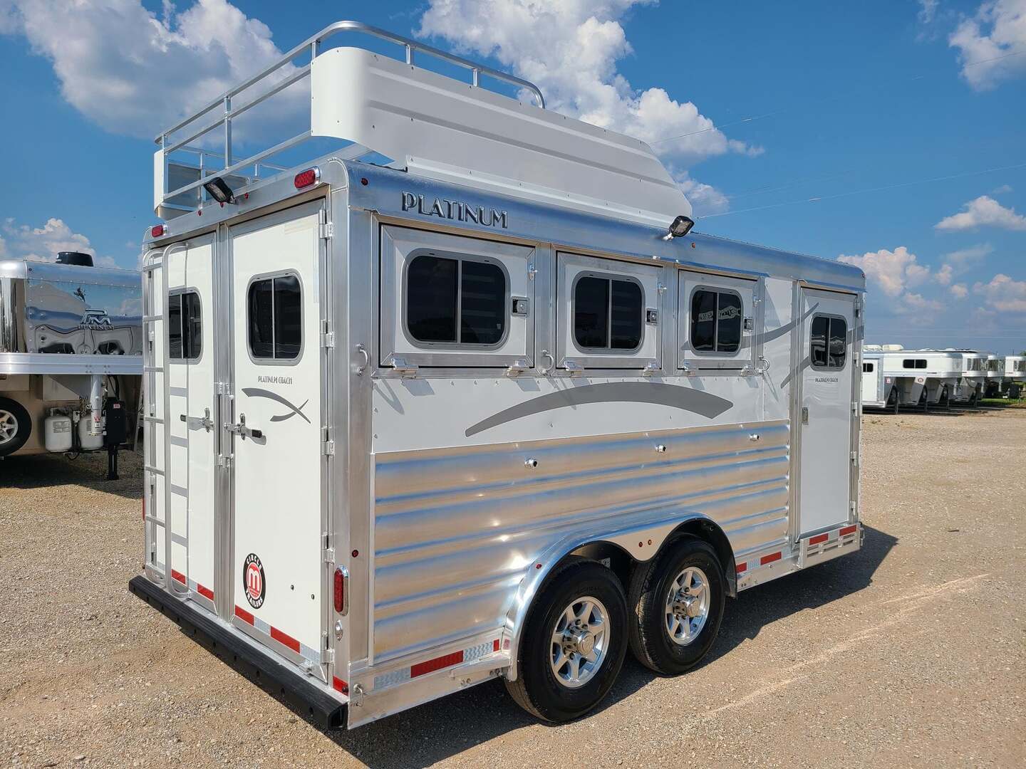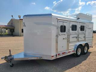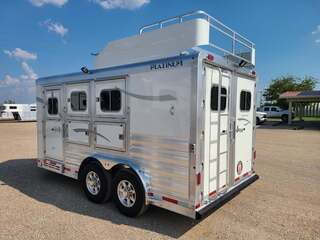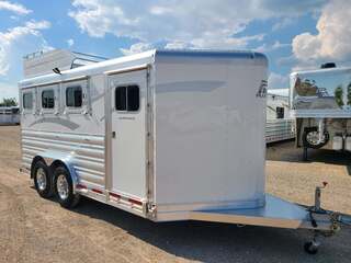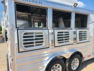 THIS TRAILER IS ON ORDER AND WILL ARRIVE IN FEBRUARY Platinum Coach 3 Horse Bumper Pull 8’ wide x 15 x 7 tall Mag aluminum wheels Two mangers with escape door on first horse Drop down windows on head/hip Drop down window bars Carpeted rear tack with hooks Carpet on dressing room wall with bridle hooks 3 tier swing out blanket bar Baby panel 6’ hay rack Round LED clearance lights LED load lights Flip down steps for escape door and dressing room door