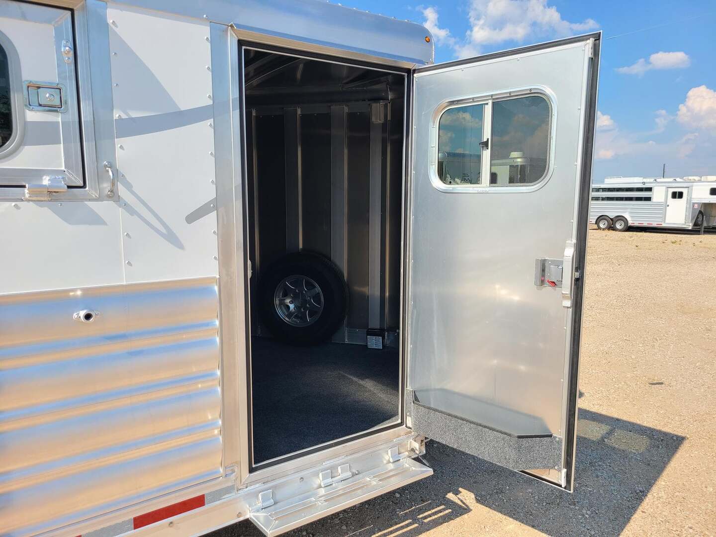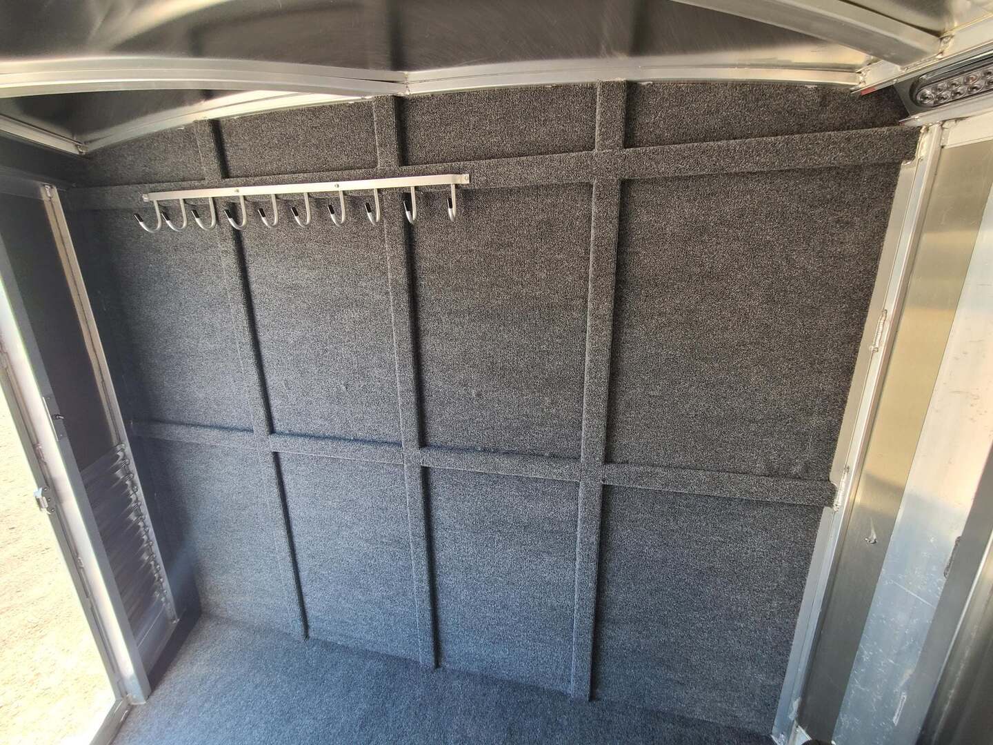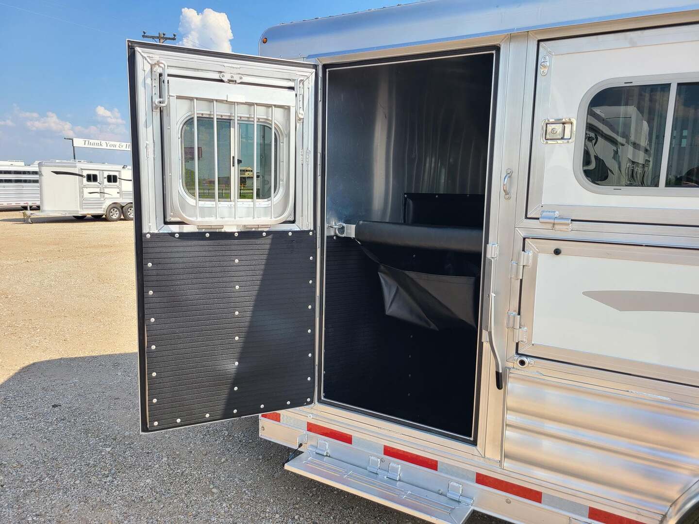 THIS TRAILER IS ON ORDER AND WILL ARRIVE IN FEBRUARY Platinum Coach 3 Horse Bumper Pull 8’ wide x 15 x 7 tall Mag aluminum wheels Two mangers with escape door on first horse Drop down windows on head/hip Drop down window bars Carpeted rear tack with hooks Carpet on dressing room wall with bridle hooks 3 tier swing out blanket bar Baby panel 6’ hay rack Round LED clearance lights LED load lights Flip down steps for escape door and dressing room door
