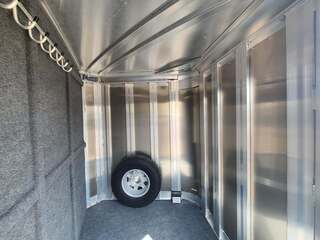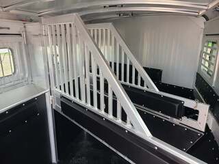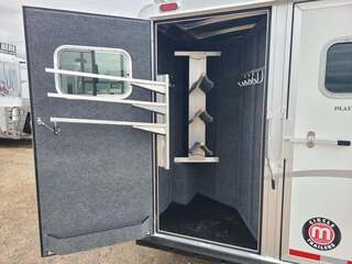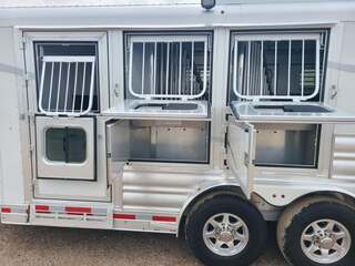 Platinum Coach 3 Horse Bumper Pull 8’ wide x 15 x 7 tall Mag aluminum wheels Two mangers with escape door on first horse Drop down windows on head/hip Drop down window bars Carpeted rear tack with hooks Carpet on dressing room wall with bridle hooks 3 tier swing out blanket bar Baby panel 6’ hay rack Round LED clearance lights LED load lights Flip down steps for escape door and dressing room door