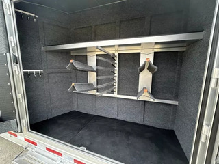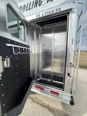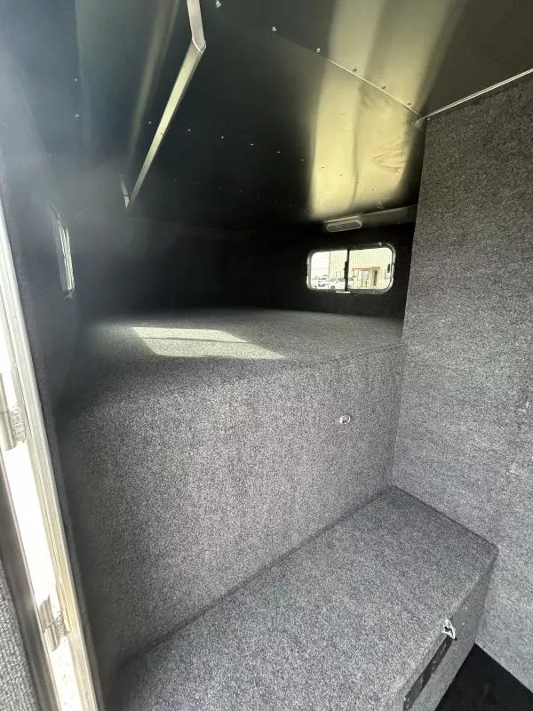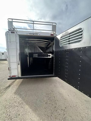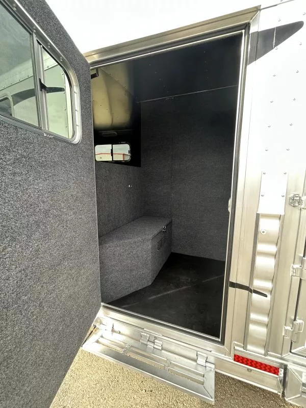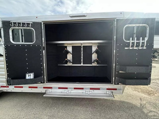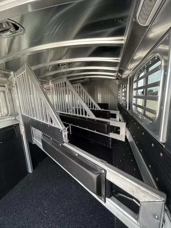 * 22’ long, 8’ wide, 7’ tall * All-aluminum construction * 4-horse slant load * Mangers on all stalls * Flow-through dividers with removable baby panel * Drop-down head-side windows with bars * Rubber-lined walls and full floor mats * Interior lights and roof vents * Rear 50/50 double doors with windows Tack & Storage: * 4’ short wall dressing room * Rear tack with 4 saddle racks * Bridle hooks and brush trays