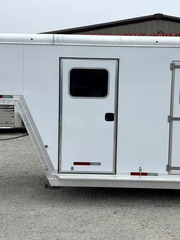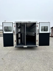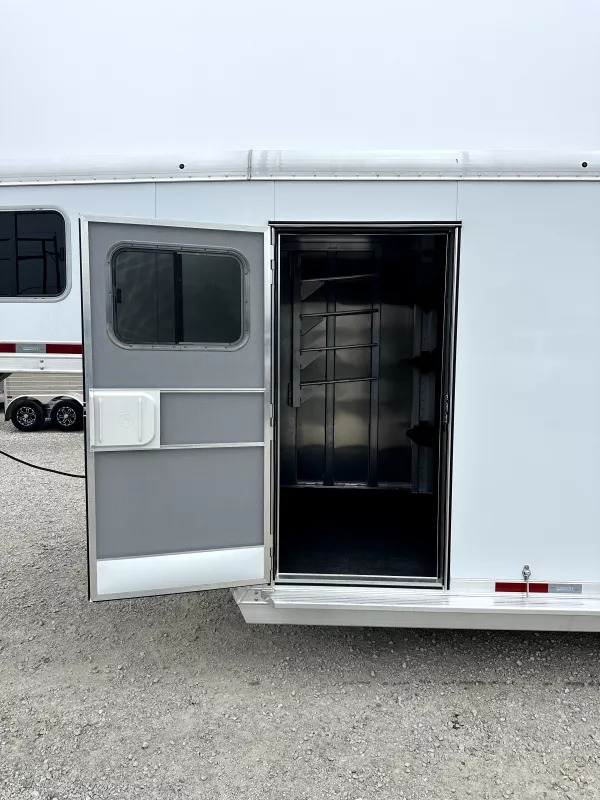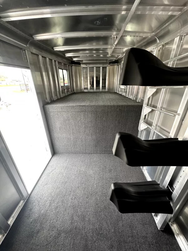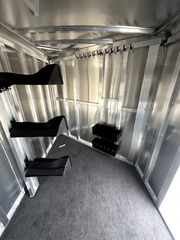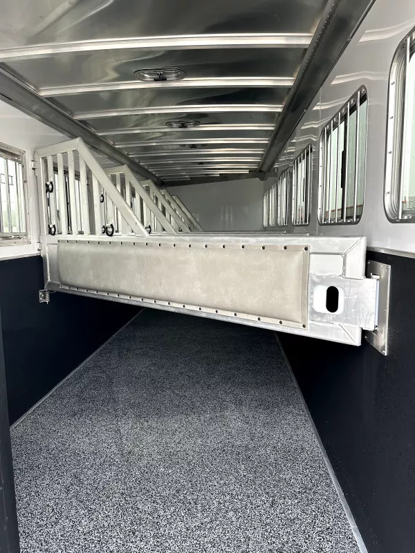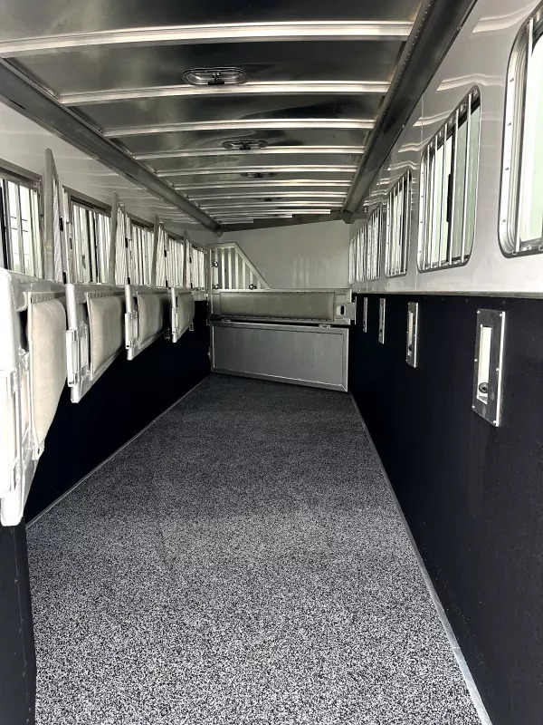 Horse Area - easy care floor, kick pads, lined and insulated walls, spring loaded padded air-flo dividers, 1 drop down stud divider, 6 pop up roof vents, 6 drop down windows w/ folding face guards (head), sliding bus windows (hip), 5 tie rings per stall, interior LED load lights, escape door, nylon butt & chest straps, folding and removeable rear tack w/ 3 tier removeable and adjustable salle rack, 1 interior LED rear tack light.