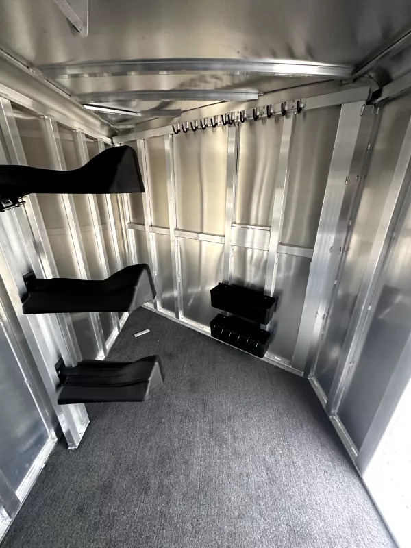 Dressing Room Area - swinging screen door, 4 tier swing out pad tree, removeable & adjustable 3 tier saddle rack, 2 brush boxes, 12 aluminum bridle hooks, aluminum clothes rod, interior LED lights, carpet nose, drop wall, and floor, extra place holder location for saddle rack.