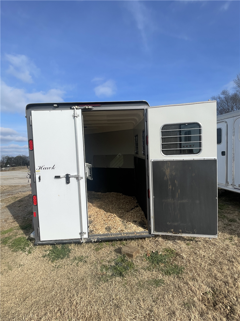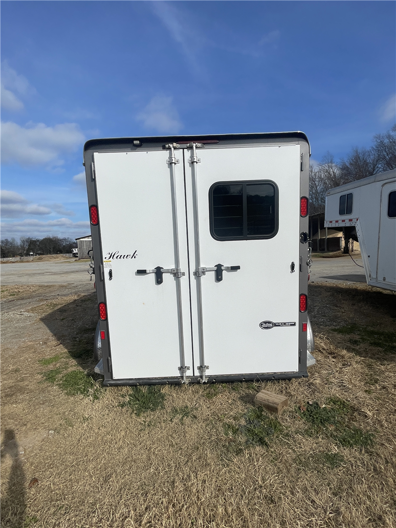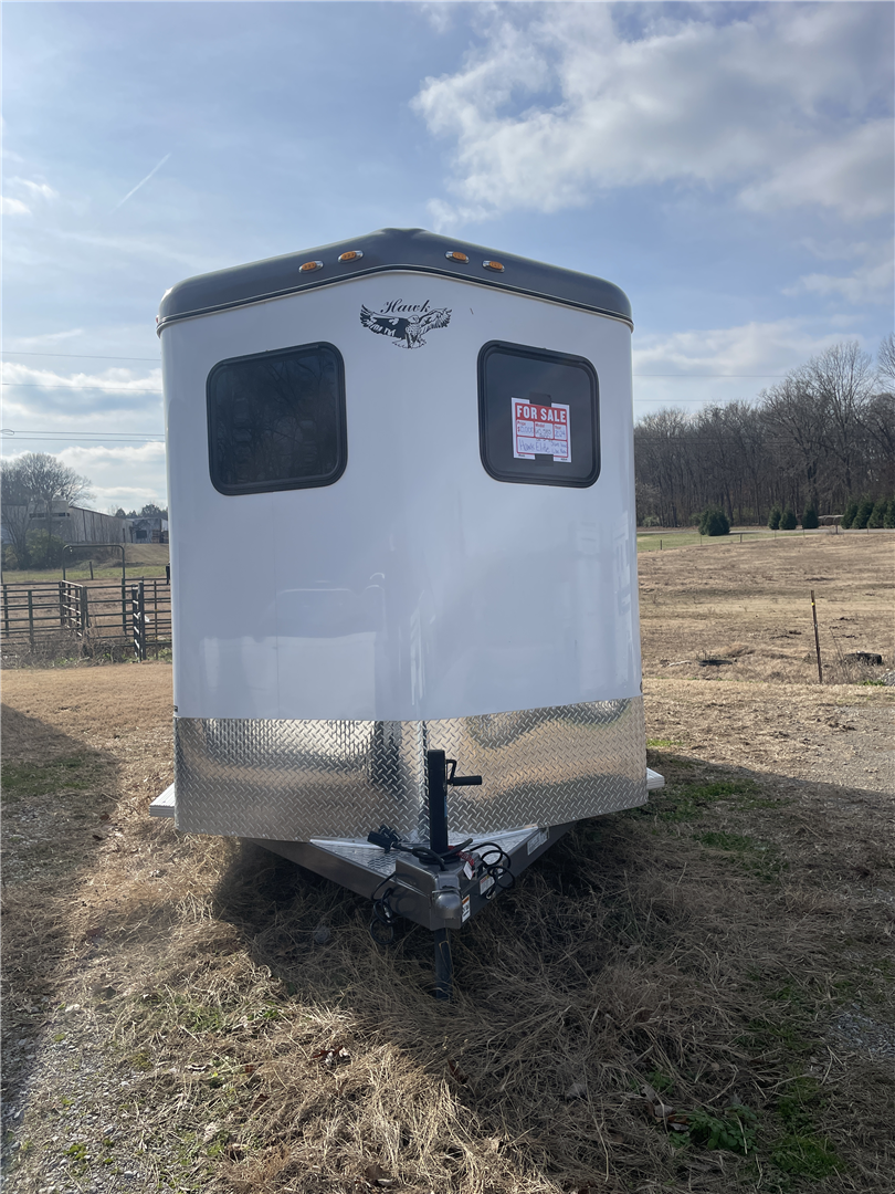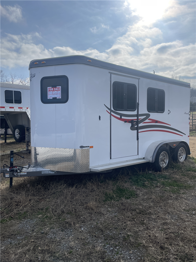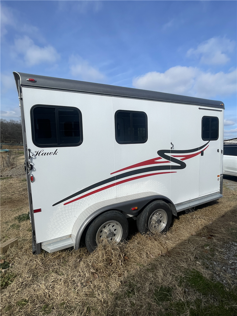 2024 Hawk 2 Horse Slant Elite with Dressing Room 7'4" Tall 80" Wide 15' Long 3,500# Axles Empty Weight of 3,560# Electric Brakes 15" Tires Spare Tire 1' Added to the Dressing Room Additional Saddle Post in Dressing Room Carpeted Dressing Room Bridle Hooks Brush Tray Full Length Aluminum Running Boards Aluminum Wheels LED Lights Additional Load Lights Feed Bags Divider Pads Roof Vents Escape Door Drop Down Windows on Head Side Slider Windows on Hip Side 1-Piece Fiberglass Roof