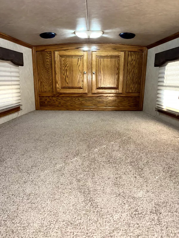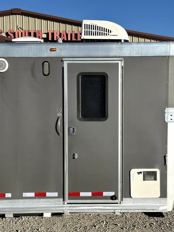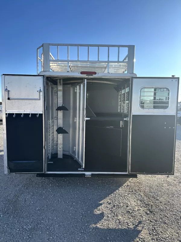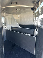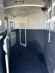Horse Area - Rubber mats, kick pads, 1 interior LED load light, 2 pop-up roof vents, 2 tie rings per stall, drop down windows w/ folding face guards (head), stock windows (hip), padded solid spring-loaded divider, stud divider, 1 fan, padded chest & butt bars, folding and removeable rear tack w/ 2 tier carpet covered removeable saddle rack, brush box, folding blanket bar, 5 alum bridle hooks, 1 interior rear tack light.