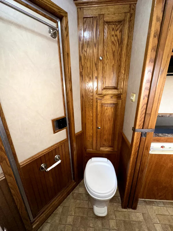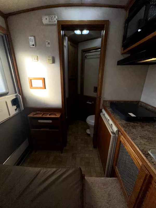 Bathroom Features - Pocket privacy door, toilet, shower, crank up vent w/ fan, wardrobe closet, linen cabinets, walk-thru door to horse area.