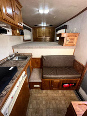 Interior Features - 1 exterior speaker, 1 exterior LED porch light, 1 handhold at camper door, swinging screen door, 3 interior roof speakers, radio, roof-mounted AC, cabinets in nose, 110 outlets, 1 step into bunk, sofa bench, soft-touch walls, digital fluid monitor, furnace.