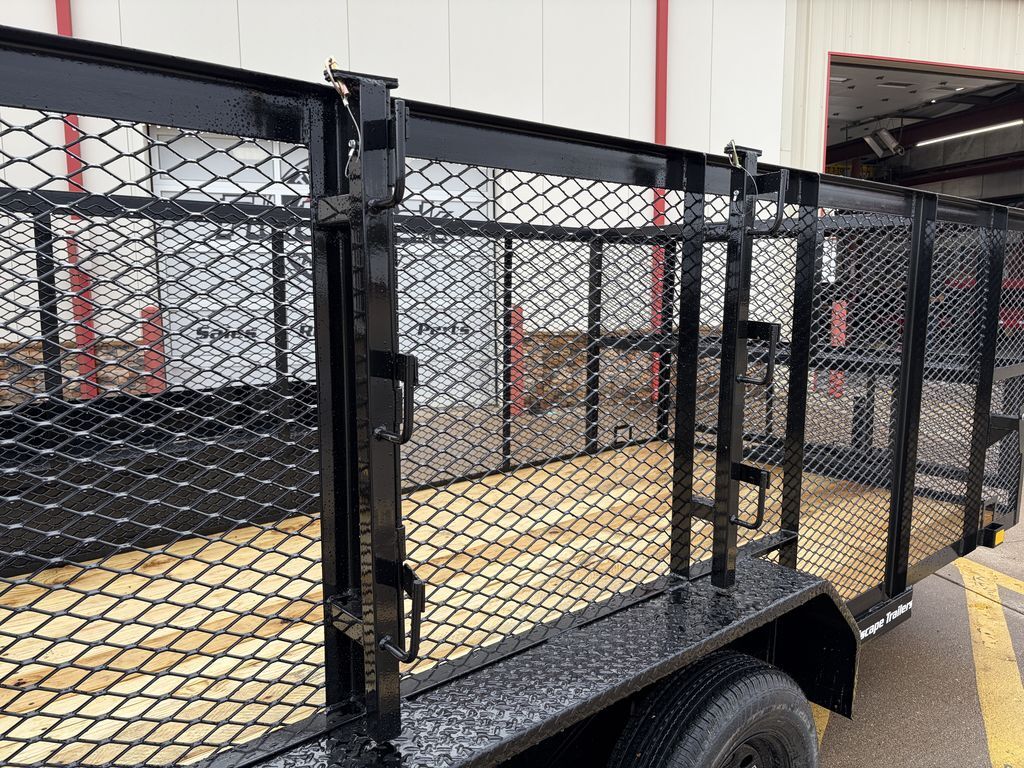 77 in x 16’ x 48 in Landscape Trailer 2 x 3,500 lb. Axles (Brakes on Rear Axle) ST 205 75 R15 Upgraded Radial Tires 48 in Expanded Metal Sides Front Toolbox Front Water Holder Solid Side Fender Baskets Front Tongue Basket w/ Top Cover H/D Spare TIre Mount 48 in Spring Assist Rear Ramp Gate Weed Eater Racks Stake Pockets with Cut Outs 4 in Channel Wrapped Tongue 2 in 8K Coupler 3 in x 2 in x 3/16 in Angle Frame Treated Wood Floor 7K Set Back Jack with Foot and Brace Smooth Fenders 5 on 5 Bolt Pattern Empty Weight: 2,050 lbs. GVWR: 7,000 lbs. Carrying Capacity: 4,950 lbs