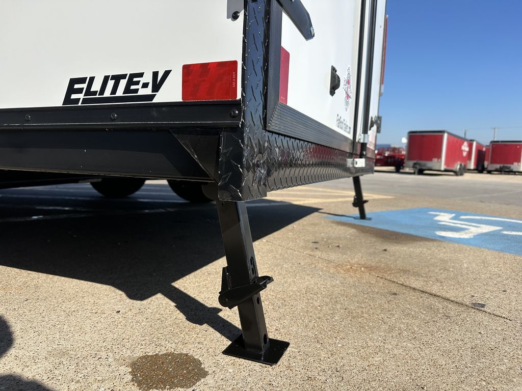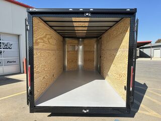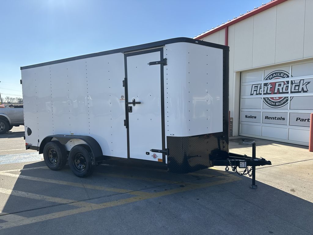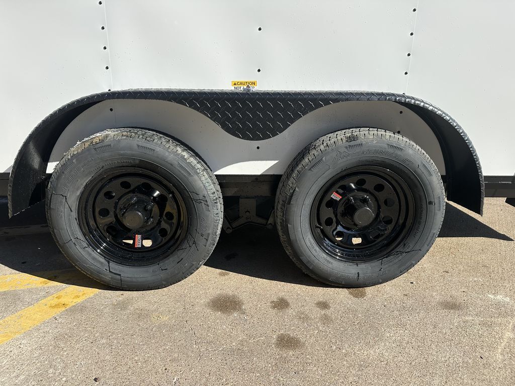7’ x 16’ Tandem Elite V Nose Cargo 2 x 3,500 lb. EZ Lube 4 in Drop Brake Axles Triple Tongue V Flat Roof System 2 5/16 in Coupler 205 75 R 15 in Radials (Black Mods, Caps, and Lugs) 2K Jack Intergraded Hitch Design Stabilizer Jacks (Rear) ATP Post Cover on V 30 in Side Door Upgrade w/ Cam Bar and RV Lock Aluminum Wrap on Rear Door Jambs 24 in ATP Front Stone Guard (Blacked Out) ATP Aluminum Fenders (Blacked Out) 6’ 6 in’ Interior Height Rear Barn Doors 3/4 in Gray Sealed Painted Floors 3/8 in Plywood Walls Empty Weight: 2,200 lbs. GVWR: 7,000 lbs. Carrying Capacity: 4,800 lbs.