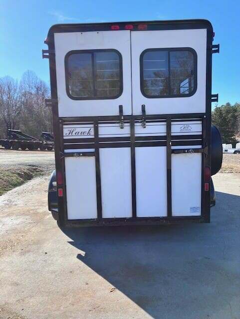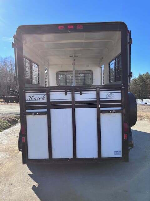 1997 Hawk 2H BP w/5’ Dress, 7’4”x6’, White, Ramp w/Curtain Doors, Windows In Curtain Doors, Aluminum Over Steel Construction, Wood Floor w/Mats, Removable Partitions, Solid Removable Head Divider, (2) Escape Doors w/Windows, (1) Roof Vent in HA, Window in Dress Wall, Wood Floor w/Carpet in Dress, (2) Saddle Racks, Bridle Hooks, Outside Mounted Spare, Torsion Axles, GVWR 7000, Empty 3800, Carry 3200