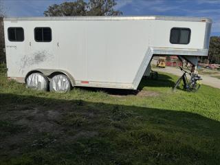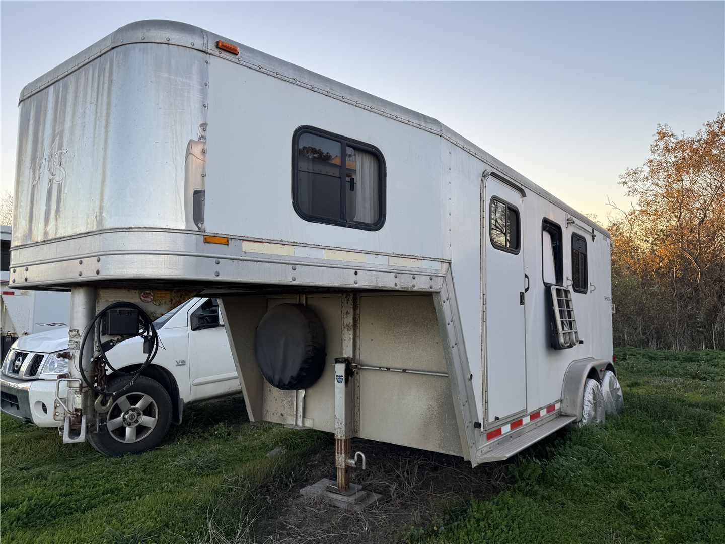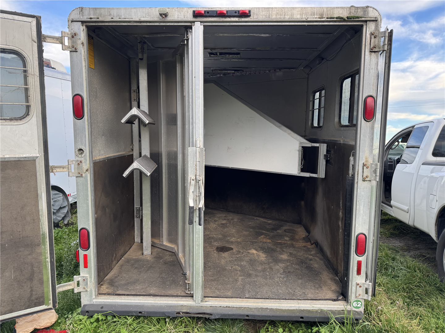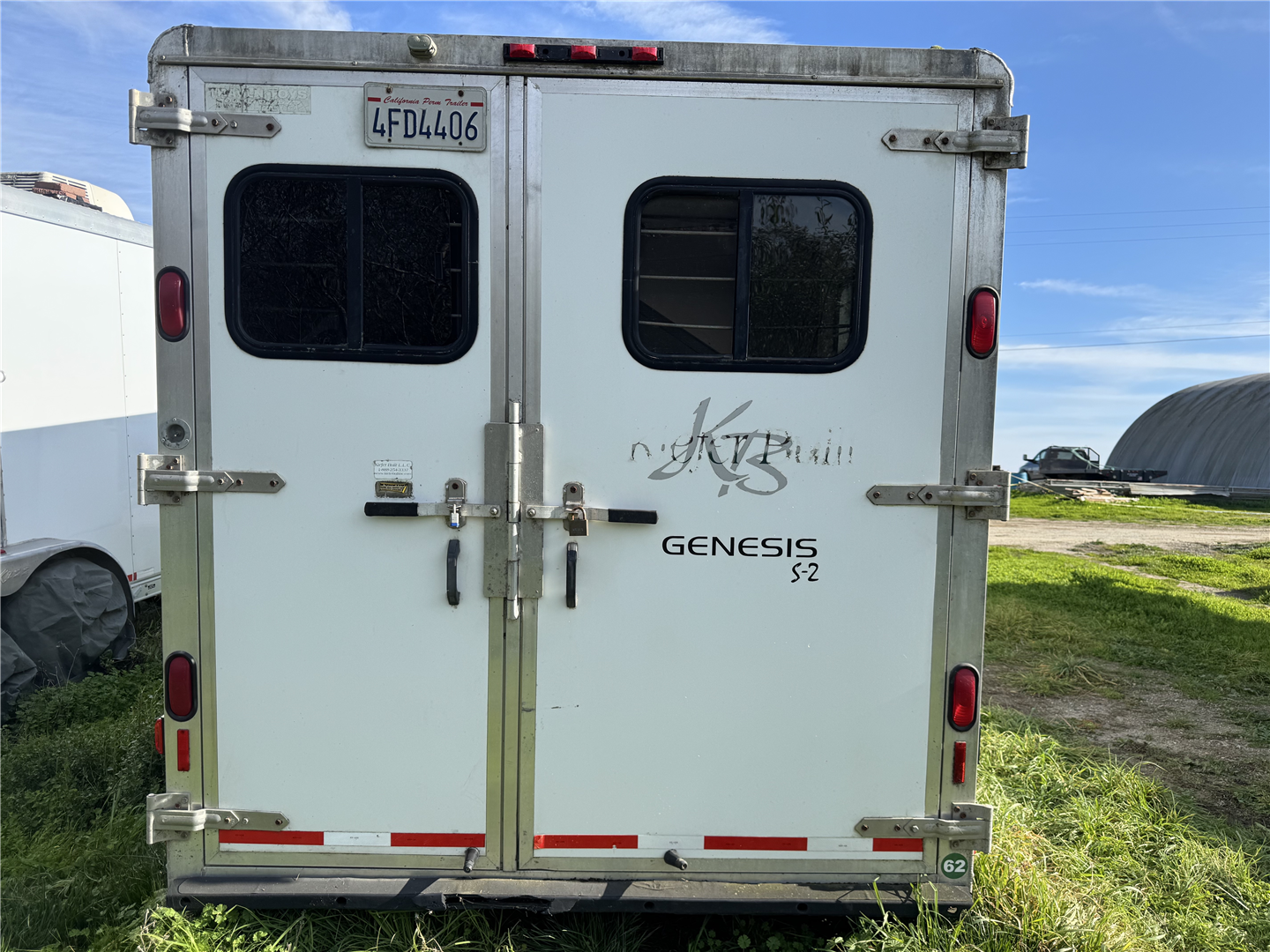 Aluminum 2003 Kiefer Built Genesis S2 GN two horse slantload trailer with 4.5’ short wall tack room. Removable rear tack space partition and swing stall partition. 40/60 rear doors; the ‘center’ post can be temporarily removed to completely open up the back of the trailer. Two-saddle rack can be used in the rear tack space or in the front tack room.