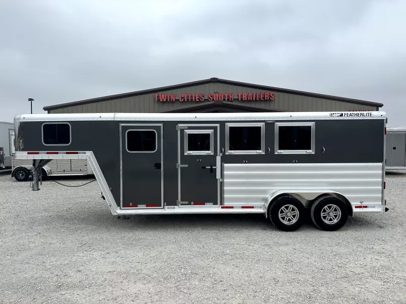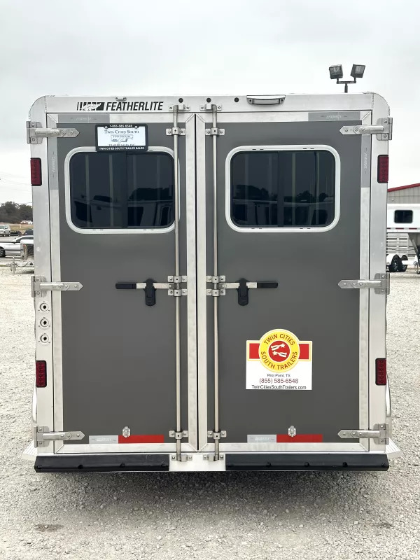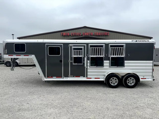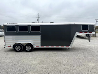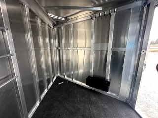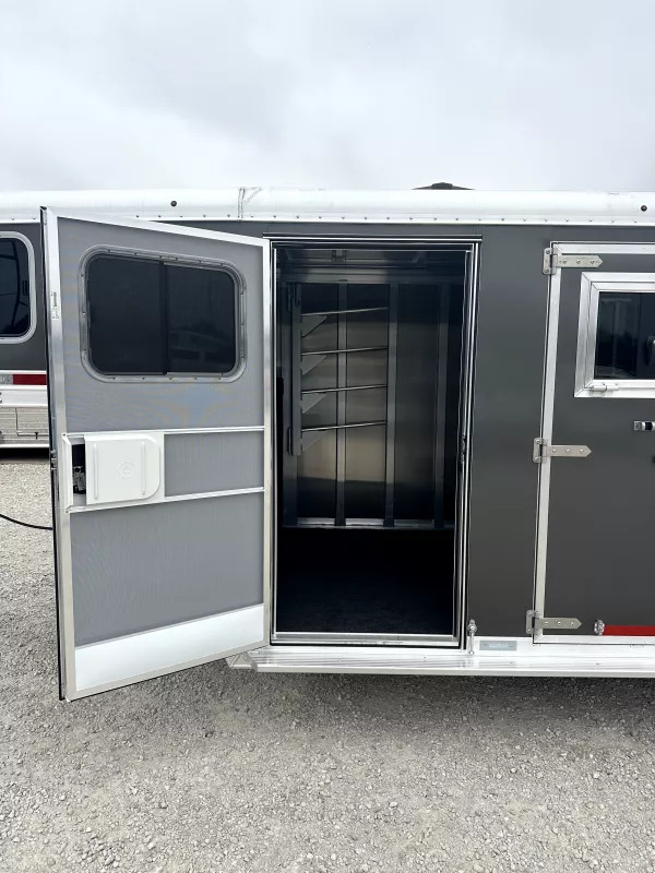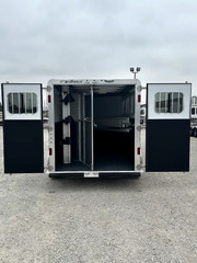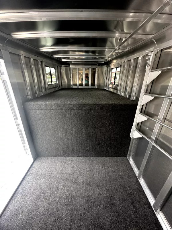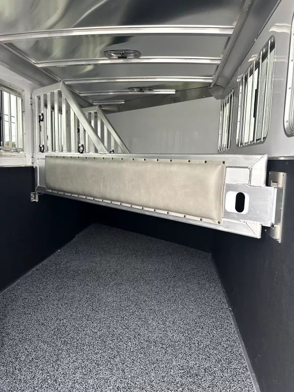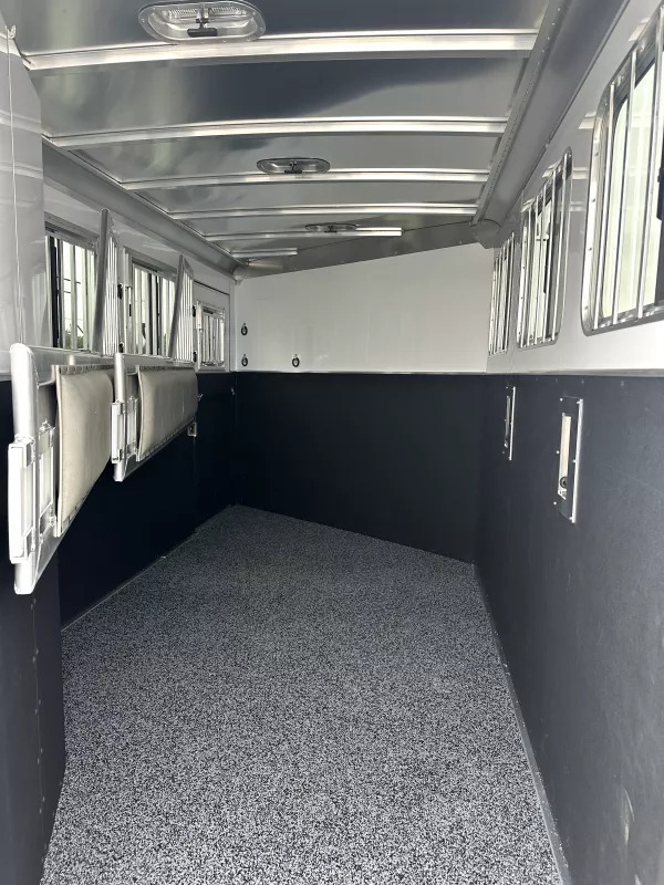 Horse Area - easy care floor, kick pads, 3 pop up roof vents, lined and insulated walls, paddded spring loaded air-flo dividers w/ slam latches, 5 tie rings per stall, interior LED load lights, 3 drop down windows w/ drop down faceguards (head), sliding bus windows (hip), escape door, nylon butt & chest straps, folding and removeable rear tack w/ 3 tier adjustbale and removeable saddle rack, 1 interior rear tack LED light.