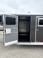 Dressing Room Area - swinging screen door, carpet on floor, drop wall, and nose, 6 aluminum bridle hooks, interior LED lights, 5’ aluminum clothes rod, brush box, extra location for removable saddle rack post, swinging 4-tier blanket bar.