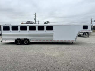 Horse Area - easy care floor, kick pads, lined and insulated walls, 6 pop-up roof vents, drop down windows w/ folding faceguards (head), sliding bus windows (hip), padded spring loaded air-flo dividers w/ slam latches, 1 stud divider, escape door, nylon butt & chest straps, 5 tie rings per stall, interior LED load lights, folding and removeable rear tack w/ 3 tier adjustable and removeable saddle rack, rear tack LED light.