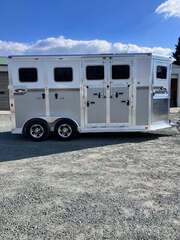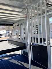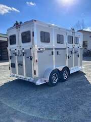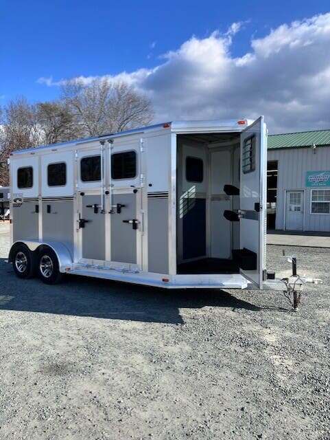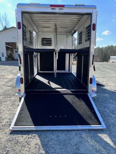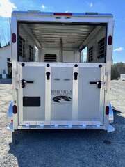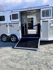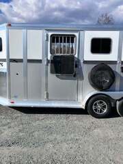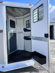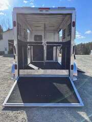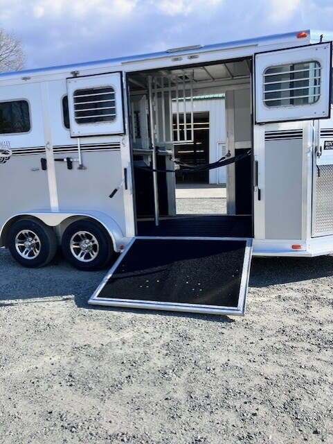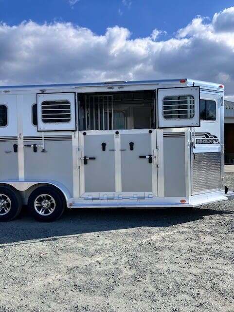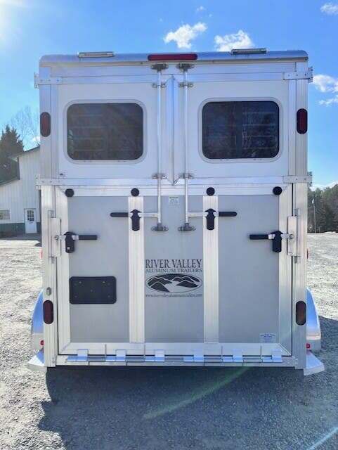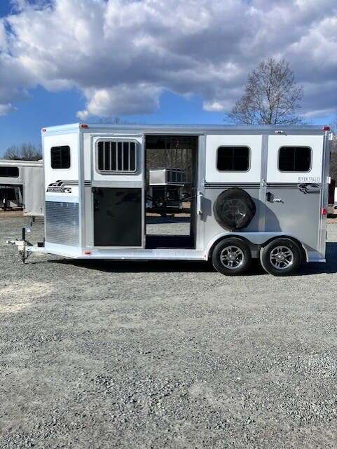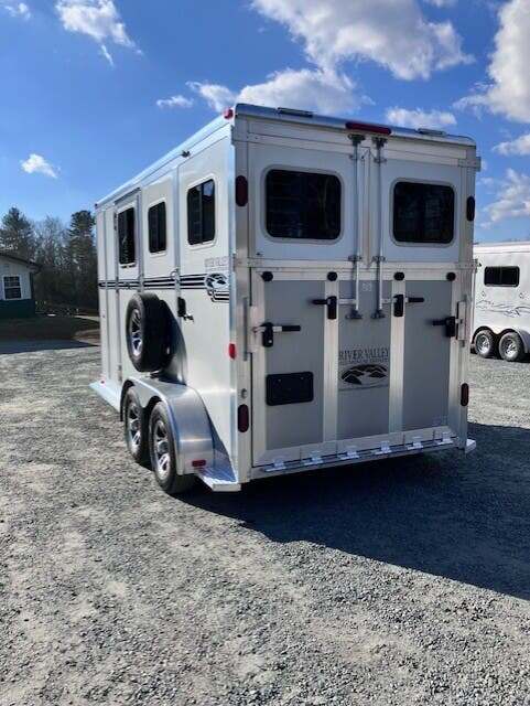 2022 River Valley 2H BP w/5’ Dress & Side Ramp, 7’6”x6’8”, Silver Top/White Bottom, Shelby Flooring in HA, Rear Ramp w/Curtain Doors, 60” Side Ramp w/Curtain Doors, Windows in Curtain Doors, Loading Lights Over Both Ramps, Outside Ties, (3) Interior Lights in HA, Roof Vents Over Each Stall, 90” Breast to Butt Bar, 13’ in HA. 1 Escape Door w/Drop Window, Pass Through Door to Dress, Removable Partitions, Tubular Head & Shoulder Dividers, Window in Dress Wall, Washable Flooring in Dress, (6) Bridle Hooks, (2) Saddle Racks, Brush Box, Interior Light at Dress Door, Spare Tire on Outside Mount, GVWR 7000, Empty 3560, Carry 3440