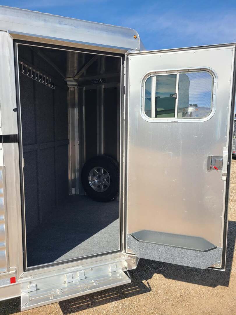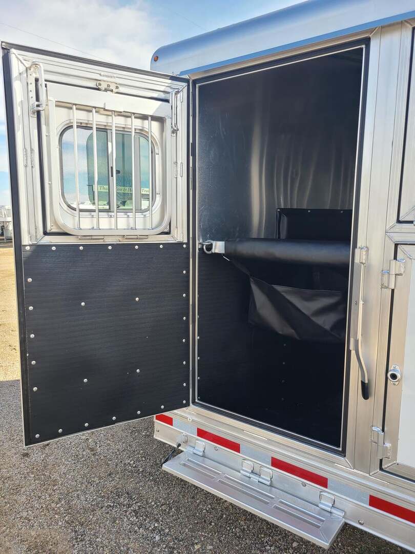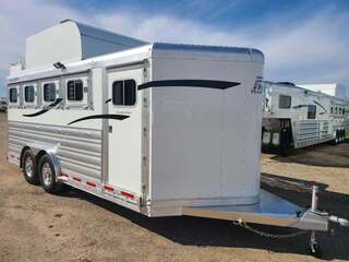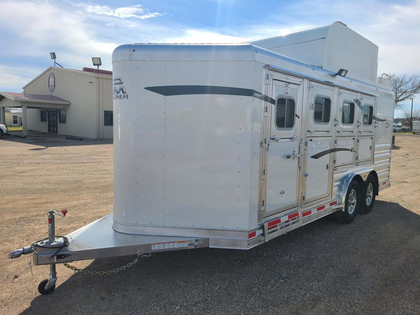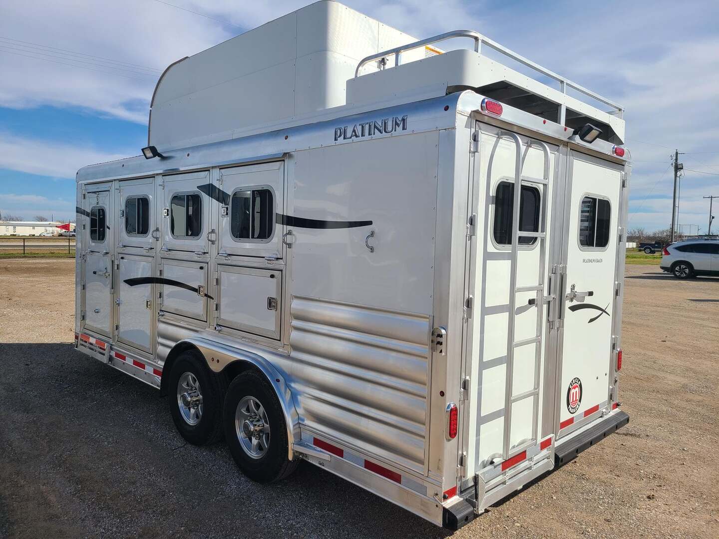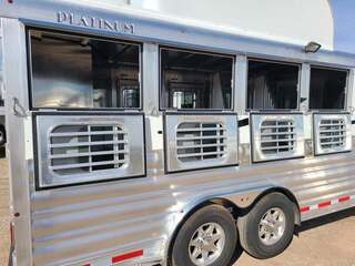 THIS TRAILER IS ON ORDER AND WILL ARRIVE IN MARCH Platinum Coach 4 Horse Bumper Pull with Mangers 8’ wide x 7’ tall x 18’ long Extended tongue, pull easier behind motor home!! 3 mangers with escape door at head 7,000# axles Aluminum wheels Drop down window on escape door Drop down window bars Drop down window on passenger side Carpeted and sealed rear tack, keep your tack CLEAN!! Flow through dividers on swinging portion of divider LED load lights on each side, one at back 6’ hay pod and 3’ landing with ladder Bridle hooks in rear tack and carpeted bulkhead wall in dressing room Fold up steps at REAR TACK, dressing room door and escape door