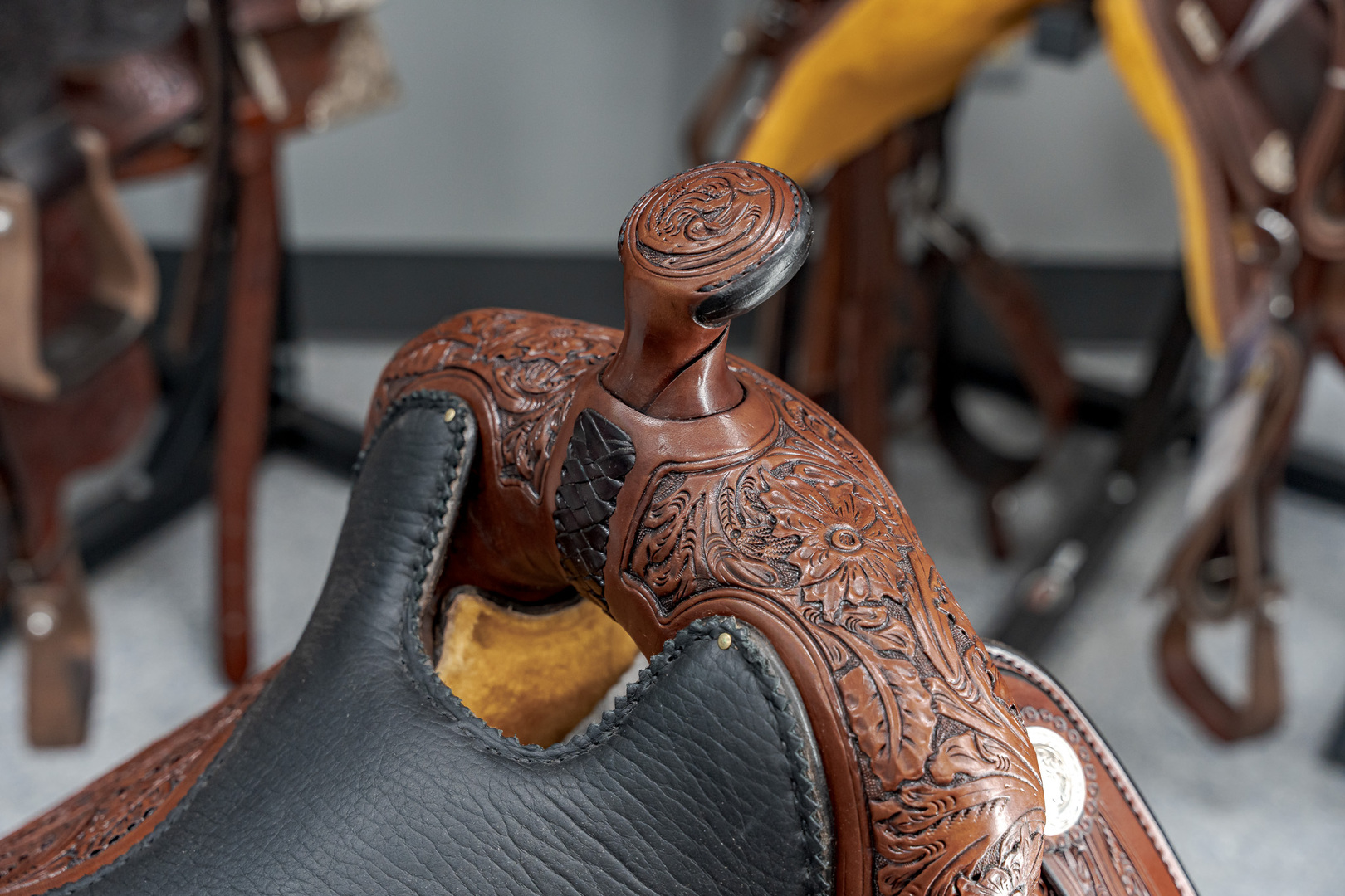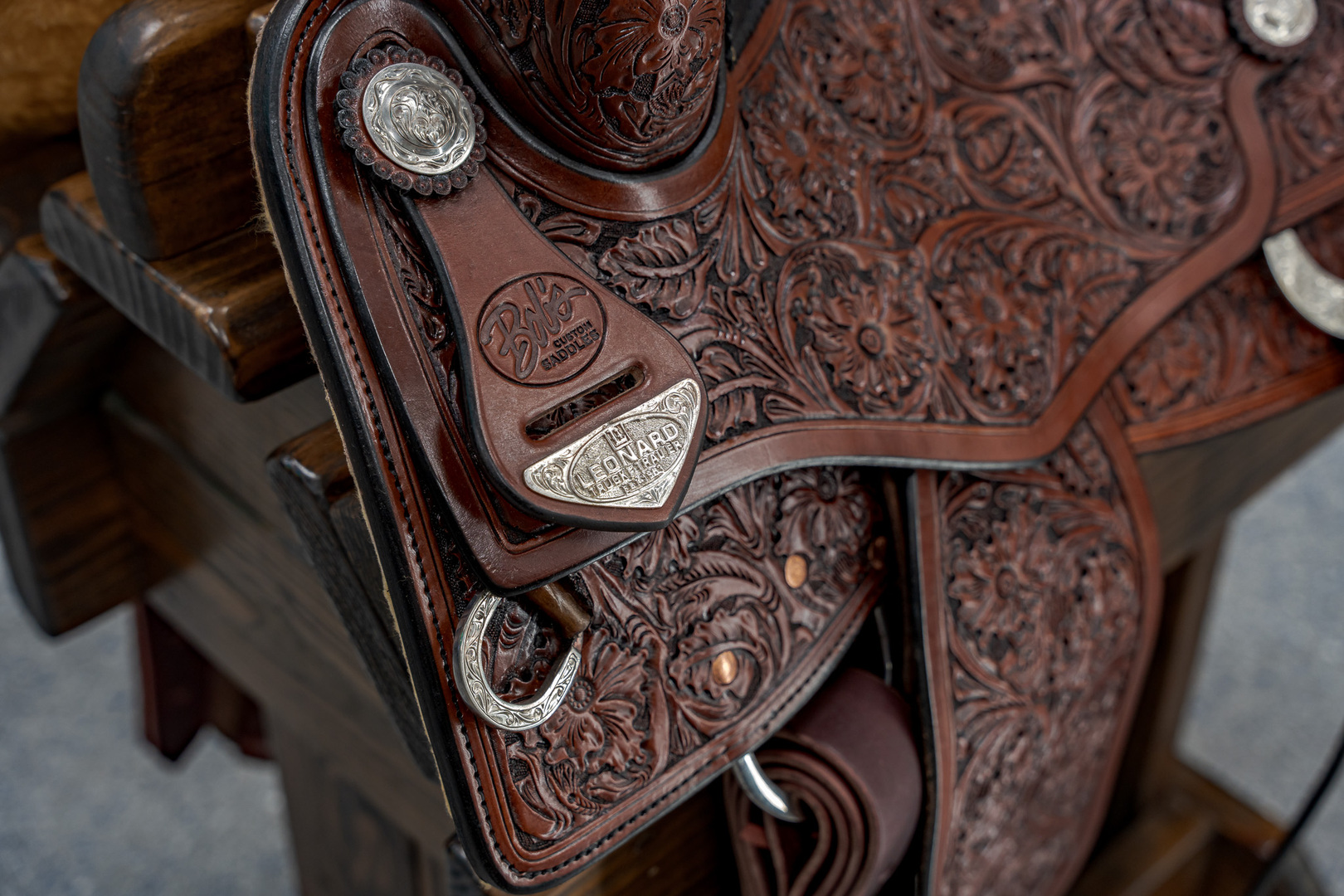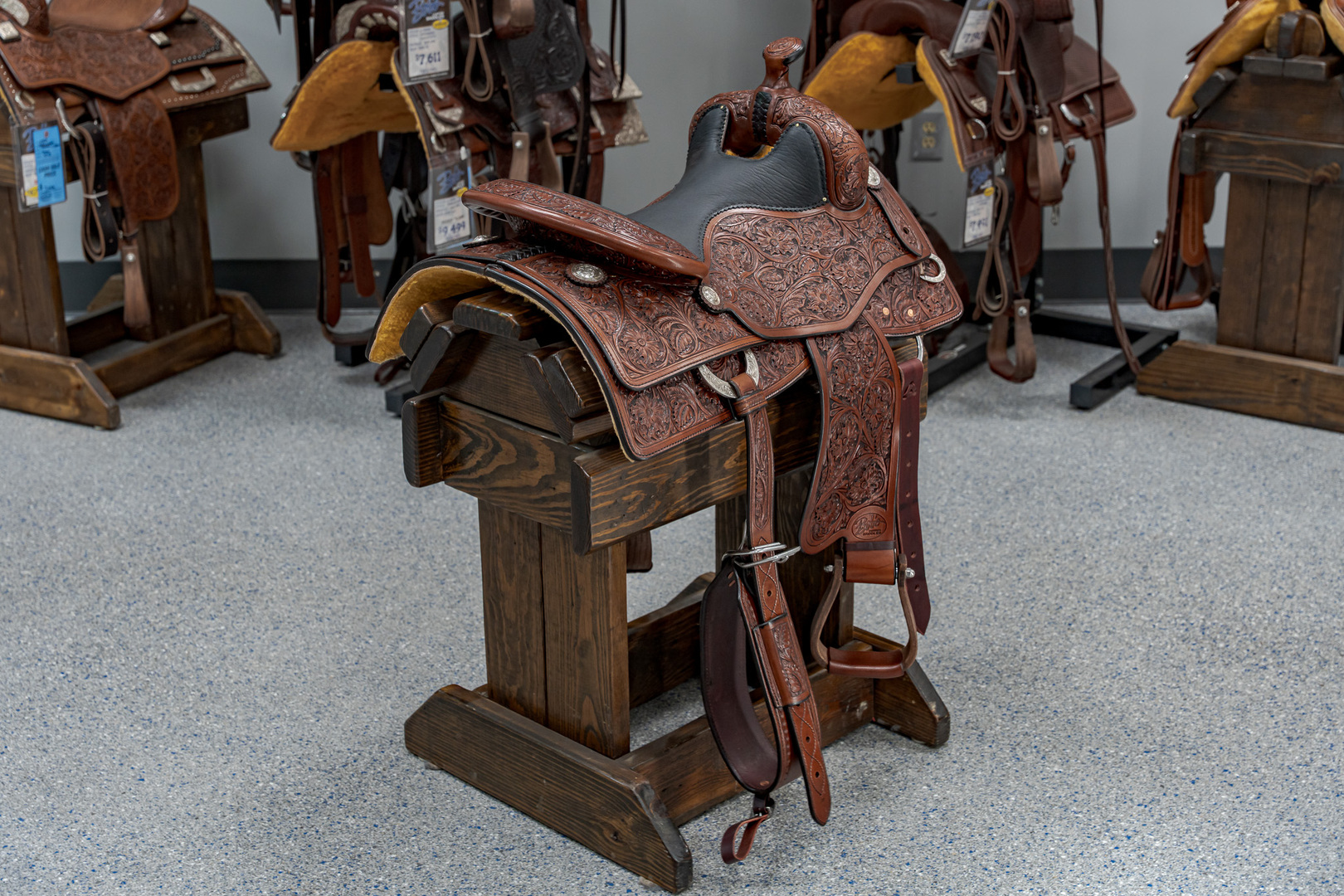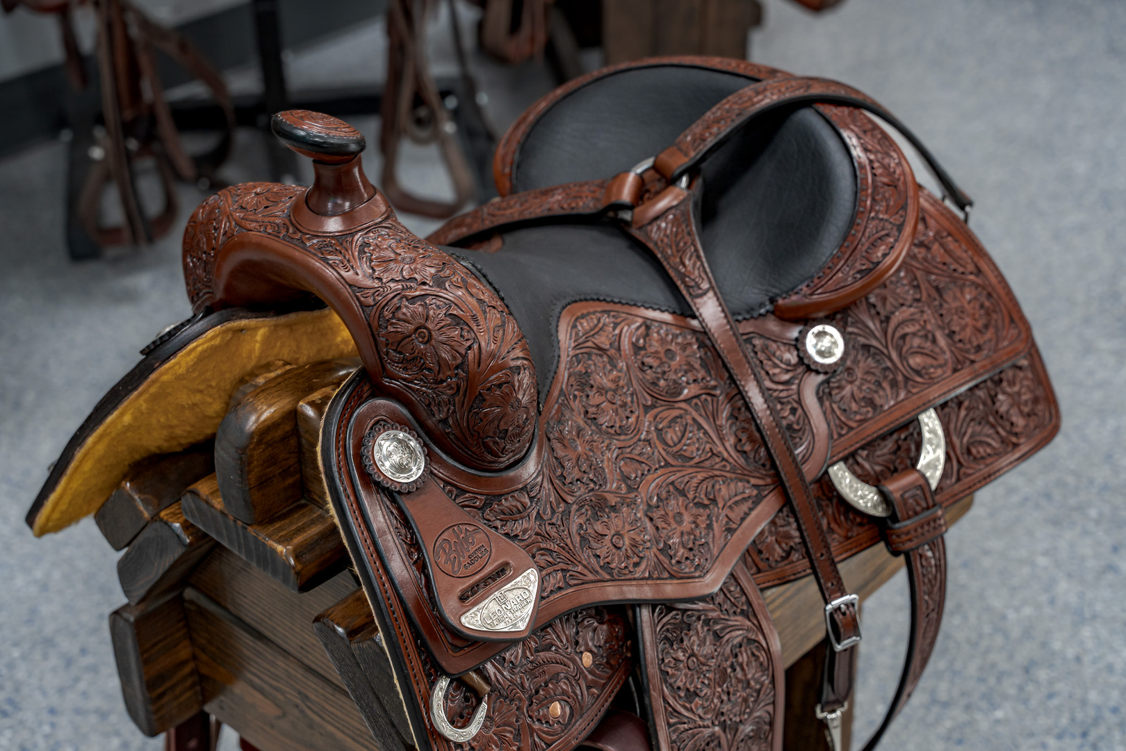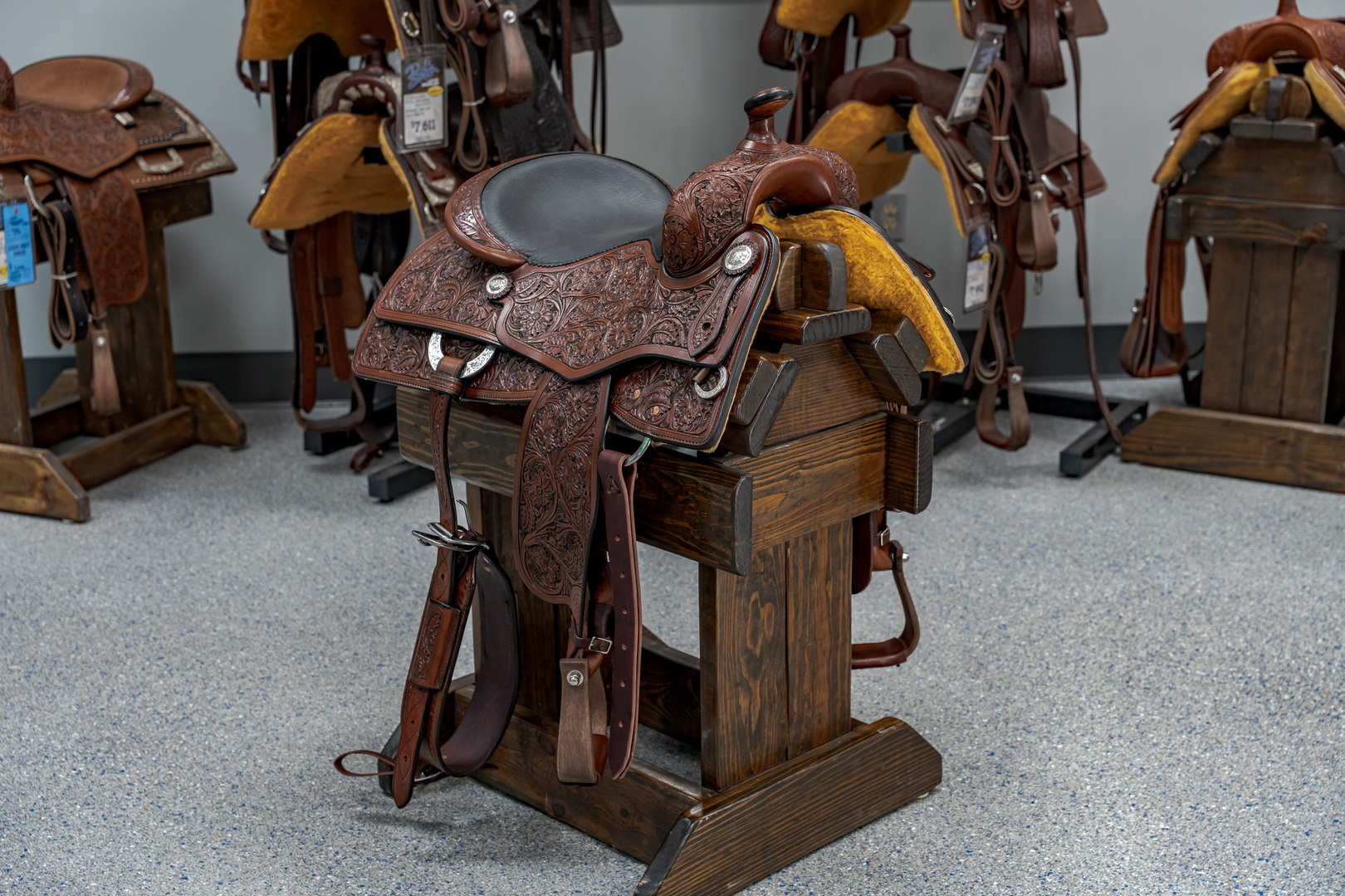 View Inventory: https://leonardtrailers.com/inventory/45293 Tim McQuay Reining Saddle Tree: 16.5in T. McQuay (8 1/2” x 6 1/2) Cantle: 3 1/4” DL Seat Style: 16” Single Narrow Padding T. McQuay Seat, Seat Color: BLACK BISON Rear Cinch included Since 1977, Bob’s Custom Saddles are built with the finest trees available; from hand-picked, top-grain hermann oak leather, real sheepskin, and hand-engraved sterling silver or silver overlay. Bob’s hand-tool every saddle, hand-lay every ground seat, hand-stitch every seat, and hand-craft each cantle. Their superior quality, craftsmanship, and performance are a prime choice for premier horsemen around the world. Proudly presented by Leonard Truck & Trailer. Stock Number:45293