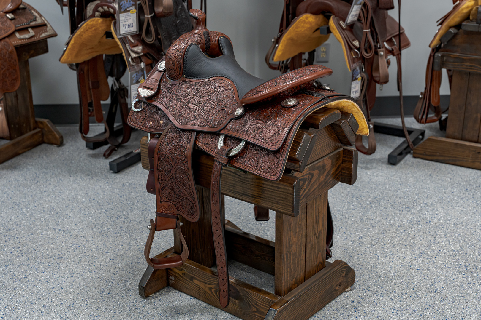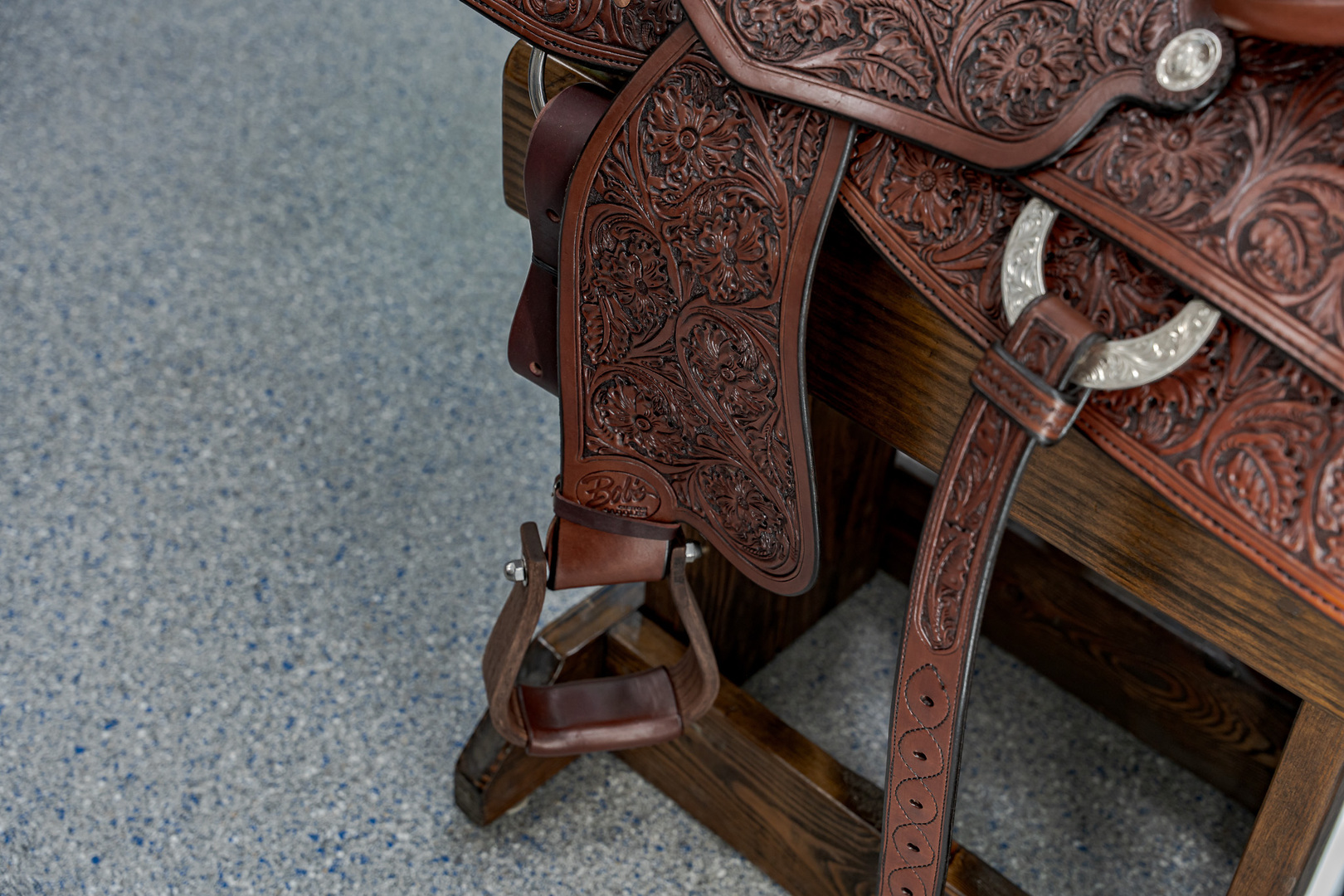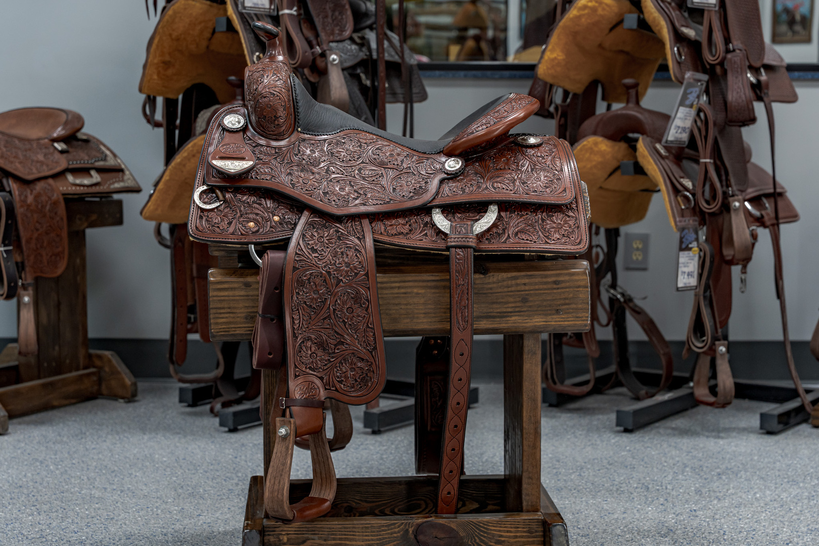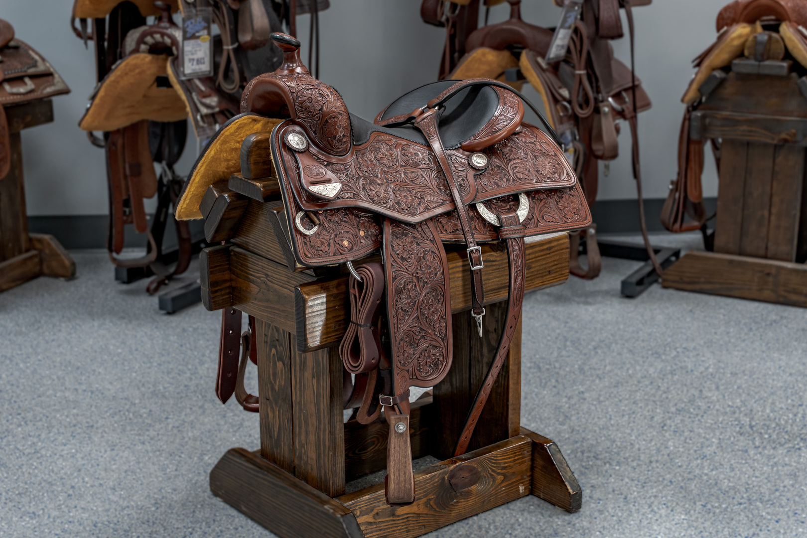 View Inventory: https://leonardtrailers.com/inventory/45293 Tim McQuay Reining Saddle Tree: 16.5in T. McQuay (8 1/2” x 6 1/2) Cantle: 3 1/4” DL Seat Style: 16” Single Narrow Padding T. McQuay Seat, Seat Color: BLACK BISON Rear Cinch included Since 1977, Bob’s Custom Saddles are built with the finest trees available; from hand-picked, top-grain hermann oak leather, real sheepskin, and hand-engraved sterling silver or silver overlay. Bob’s hand-tool every saddle, hand-lay every ground seat, hand-stitch every seat, and hand-craft each cantle. Their superior quality, craftsmanship, and performance are a prime choice for premier horsemen around the world. Proudly presented by Leonard Truck & Trailer. Stock Number:45293