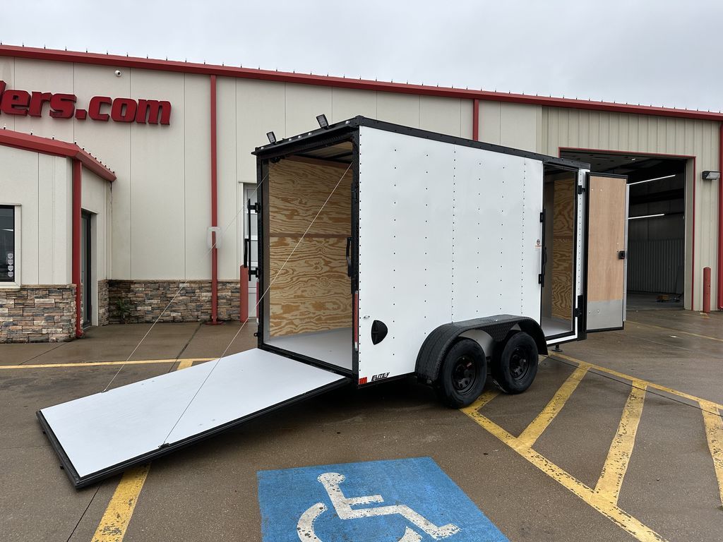 6’ x 14’ Tandem Axle Cargo Trailer Elite V Nose 2 x 3,500 lb. Dexter EZ Lube 4 in Drop Axles EV Sports Package Intergraded Hitch Design 3/8 in Plywood Lined Walls Rear Stabilizer Jacks ATP Corner Post Cover 2 5/16 in Coupler 32 in Side Door w/ RV Latch 205 75 R15 in Radials on Black Mod Wheels w/ Caps 2K Jack 16 in ATP Front Stone Guard Diamond Plate Aluminum Fenders 7’ Interior Height Rear Load Lights Spring Assist Ramp Door Gray Painted 3/4 in Plywood Floors 3/8 in Plywood Walls Empty Weight: 1,800 lbs. GVWR: 7,000 lbs. Carrying Capacity: 5,200 lbs.