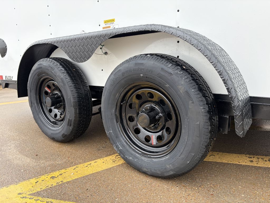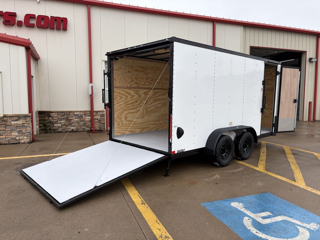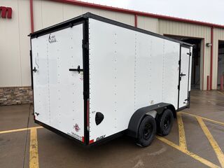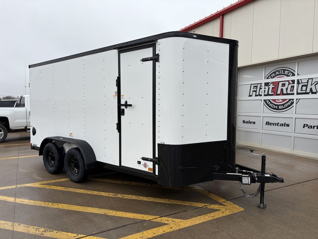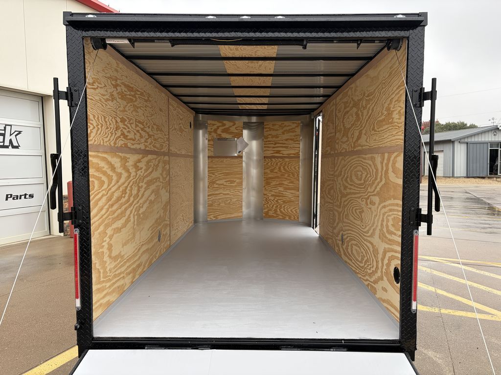 2x 3.5K EZ Lube Brake Axles 4in Drop 16in on Center Cross Members Triple Tongue 2 5/16in Coupler 205 75 R15 Tires on Black Mods 2K Jack Non Powered Roof Vent Black Out Package 6’ 6in Interior Height Spare Tire Mount Spring Assist Rear Ramp Door 30in Side Door w/ Cam Bar and RV Latch 3/4in Plywood Floor 3/8in Plywood Walls 2 Interior Lights 4 x D Rings Empty Weight 2,200lb G.V.W.R. 7,000lb Carrying Capacity 4,800lb